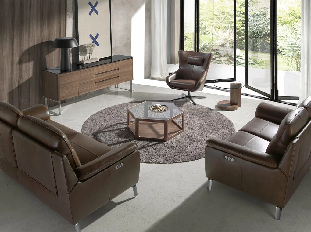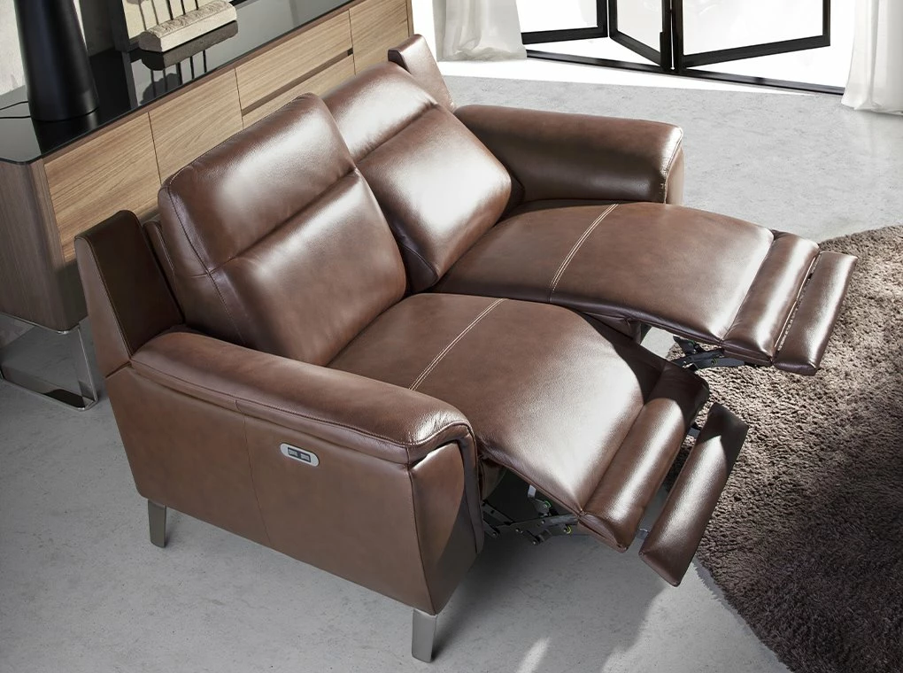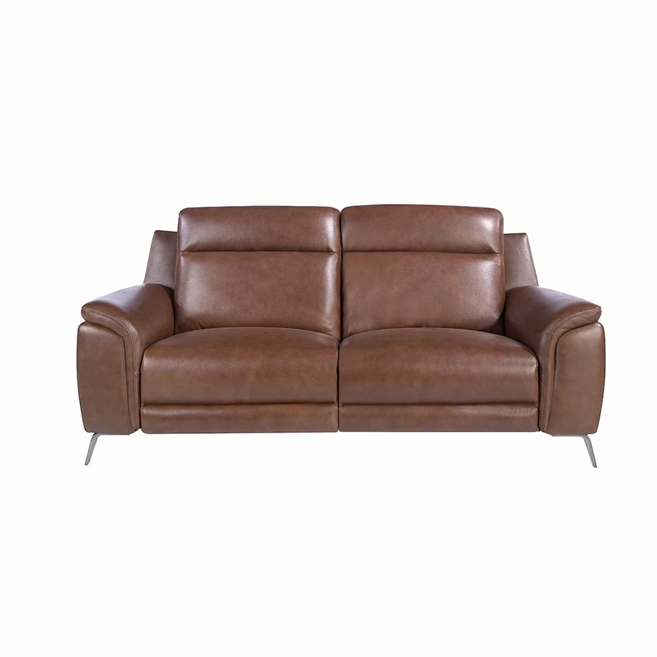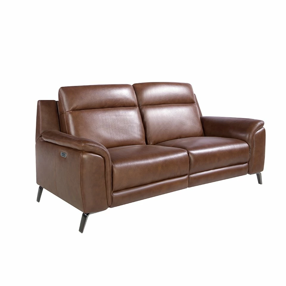 Sofá 3 plazas piel vacuno con mecanismos relax modelo 6128 Angel Cerdá S.L.Sofá 3 plazas de diseño moderno tapizado en piel vacuno de 1mm de espesor color marrón coñac. Sus asientos con mecanismos eléctricos de relax le aporta ese extra de comodidad que necesitas para disfrutar de su momento de tranquilidad. Un sofá de estilo minimalista y único, con una robusta estructura interna de madera de pino natural y patas de acero inoxidable oscurecido que le otorga ese toque de tendencia y elegancia que busca para su salón. La combinación perfecta entre diseño, elegancia y confort.• ESTILO: Este original sofá 3 plazas tapizado en piel de origen vacuno color marrón coñac de la más alta calidad aportará el toque original y personal que buscas para su hogar, fiel a las últimas tendencias en decoración. • MULTIESTANCIA: Versátil y funcional, su elegante y sencillo diseño permite que encaje en cualquier tipo de salón, convirtiéndose en el gran protagonista de su salón. • CALIDAD: Todos nuestros sofás están fabricados con materiales de la más alta calidad, siendo garantía de mobiliario duradero y funcional. • DECORACIÓN: Gracias a su elegante diseño modero y original, así como a la combinación de tonalidades cálidas como la de su piel vacuno color marrón coñac con el acero inoxidable oscurecido de sus patas, lo convierten en un sofá perfecto para aportar el equilibrio perfecto entre estilo y comodidad que busca para su hogar. • CONFORT: El tamaño de sus asientos y su relleno en espuma de poliuretano de 20kg/m3, así como sus dos mecanismos relax, le permitirá contar con el máximo confort, sin dejar de lado la más alta tendencia.