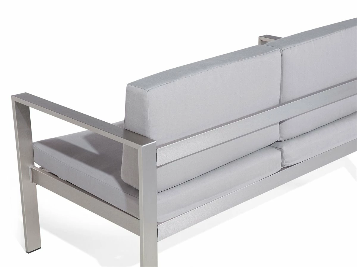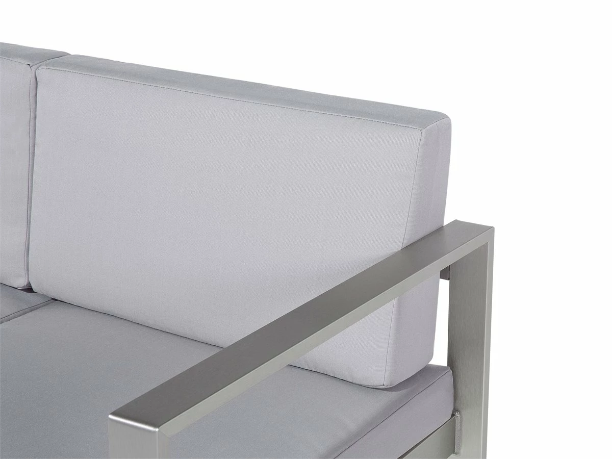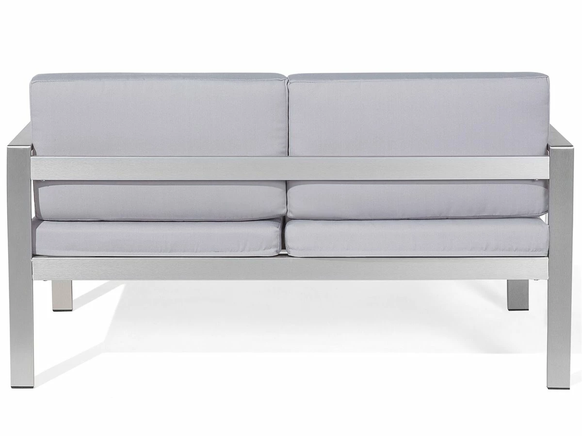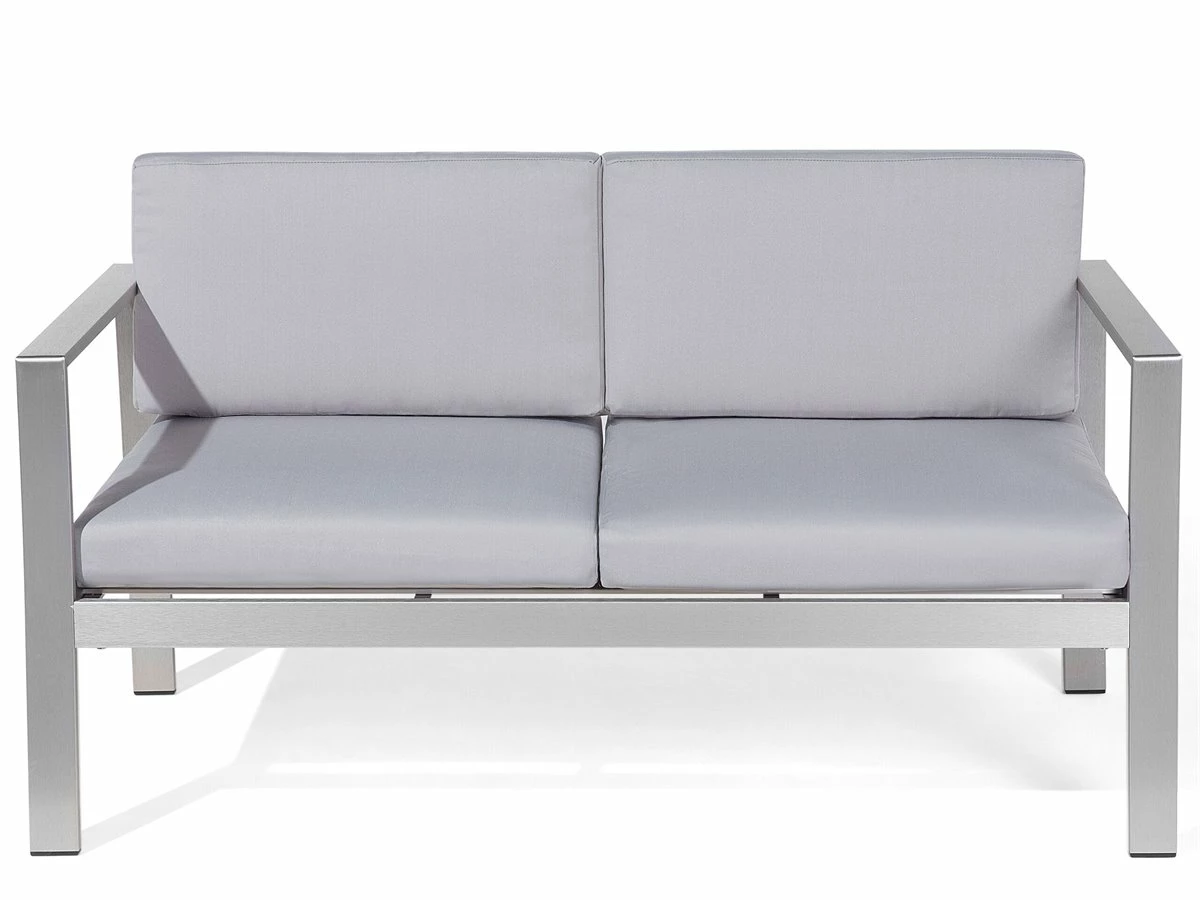 Sofá para exteriores. El sofá de jardín presentado es una combinación perfecta de modernidad y un toque de elegancia. Gracias a cómodo y ancho asiento, el sofá proporciona la comodidad óptima para dos personas. El marco estable está hecho de aluminio. El conjunto incluye dos cómodos cojines de asiento y respaldo hechos de poliéster de la más alta calidad y fácil de cuidar, resistente a la humedad y la suciedad. El material resistente a la intemperie está adaptado para el uso en exteriores y sin duda te complacerá durante muchos años. Detalles: Tipo de Producto: Banco Estilo: Moderno Color: Gris Tipo de material: Metal Material principal: Aluminio Material adicional: Poliéster Composición del Material: 100% Poliéster Densidad de espuma del asiento: 20 kg/m3 Dimensiones: Altura del apoyabrazos: 17 cm Profundidad: 70 cm Espesor del asiento: 10 cm Altura del asiento: 45 cm Ancho: 142 cm Altura: 80 cm Superficie del asiento: 130×60 cm Peso: 20 kg Capacidad de peso: 300 kg La oferta incluye: 1 x Sofá de 2 plazas Ventajas: Confort del asiento óptimo, Diseño elegante, Perfecto para todo tipo de exterior, Robusto marco resistente a la corrosión, Resistencia UV 7 (ISO 105-B02, Fundas extraíbles Información de montaje: Requiere montaje completo. 20-40 min. Información adicional: El producto viene con un libro de cuidados detallado para ayudarte a mantener tus muebles en las mejores condiciones durante muchos años. Consulta estos consejos para garantizar el mantenimiento adecuado de tus muebles nuevos – encontrarás las instrucciones de mantenimiento junto con el manual de montaje. Texto de resistencia: El producto está hecho con tela resistente a los rayos UV, lo que significa que se puede usar bajo la luz del sol sin preocuparse por la pérdida de color. En cualquier caso, es recomendable colocar los muebles debajo de una cubierta impermeable cuando no se utilicen, para asegurar su máxima durabilidad. Resistencia: Rayos UV Consejos de mantenimiento: Aluminio: 1.Fuera de temporada, utilice una funda protectora o guarde los muebles en un lugar fresco y seco 2.Limpiar con agua jabonosa y detergentes suaves. Quitar el polvo con un paño suave. Poliéster: 1.Lavar a mano únicamente, usar agua fría y un detergente suave 2.Cuando no esté en uso, manténgalo en un lugar limpio y seco para protegerlo de las condiciones atmosféricas 3.No secar en secadora ni planchar.