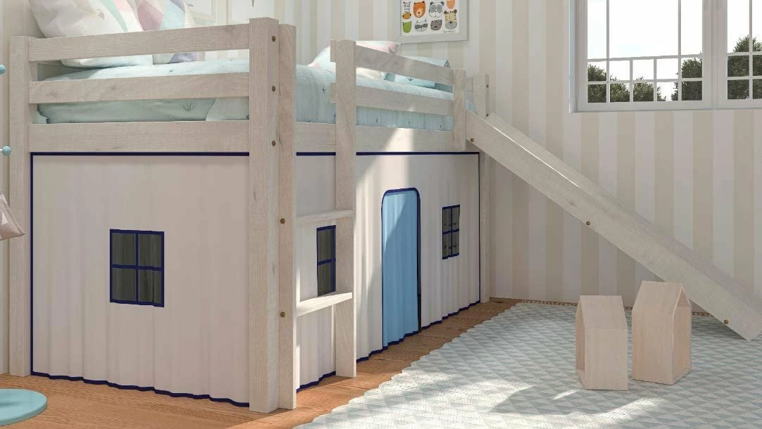 Venprodin | Fabricantes de muebles en España desde hace más de 10 años | Esta cama alta para niños está fabricada en madera de pino maciza y diseñada para entretener además de para optimizar el espacio. Color de la cama Blanco Decapé, en el que se ve la malla de la madera | La cama está equipada con barreras de protección en ambos bordes de la cama para evitar que los niños se caigan mientras duermen | El espacio debajo de la cama se puede usar para jugar, estudiar o para el almacenamiento. | La cama alta se entrega con un tobogán recreativo, además los somieres van incluidos | La cama es adecuada para un colchón de 90 x 190 cm. Tenga en cuenta que el colchón no está incluido en la entrega. Lona incluida en forma de casita. NO SE HACEN ENVIOS A BALEARES, CANARIAS, CEUTA Y MELILLA