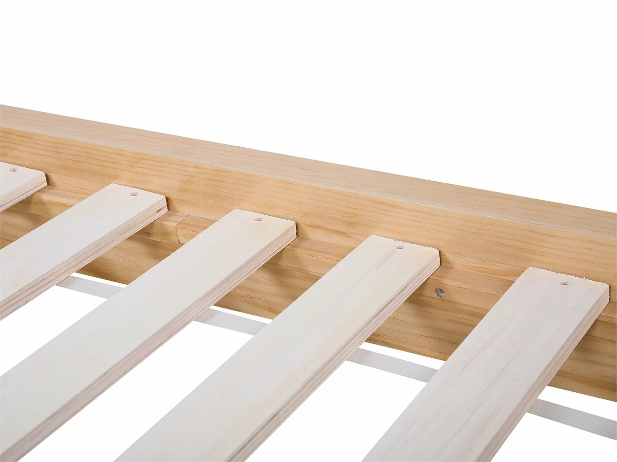Cama de estilo minimalista. Esta cama con somier combina bien en un dormitorio de estilo boho, minimalista o escandinavo. Está fabricada a partir de madera de pino de alta calidad. El somier de listones proporciona soporte al colchón. Añade un aspecto acogedor y un cierto encanto a cualquier interior. Detalles: Tipo de Producto: Cama matrimonial Estilo: Boho Color: Madera clara Tipo de material: Madera maciza Material principal: Madera de pino Material adicional: Madera contrachapada Parte posterior tapizada: No Acabado: Brillante Dimensiones: Dimensiones del reposacabezas: 142×40 Ancho: 147 cm Longitud: 207 cm Altura: 81 cm Superficie para dormir: 140×200 cm Peso: 46 kg Capacidad de peso: 200 kg La oferta incluye: 1 x Somier (32 listones, 1 x Estructura de cama, 1 x Cabecero, No incluye: colchón y ropa de cama Ventajas: Espaciosa superficie para dormir, Estilo escandinavo minimalista, El complemento ideal para todo tipo de decoracíon, Muy fácil de conservar, Solida estructura Información de montaje: Requiere montaje completo. 45-60 min. Información adicional: La altura del colchón visible en la imagen es de 20 cm. Consejos de mantenimiento: Madera de pino: 1.Limpie con un limpiador y un paño suave en la dirección del grano 2.Los muebles con acabado de aceite deben engrasarse una vez al año, 3.Seque inmediatamente después de limpiar. para evitar que se acumule agua en los muebles.