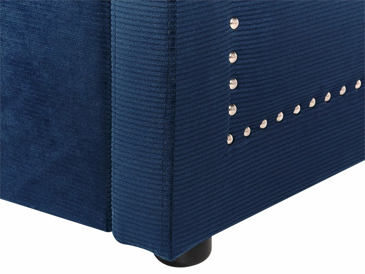 Cama nido de diseño moderno. Añade elegancia y funcionalidad a tu dormitorio o habitación infantil con esta cama con somier. Está fabricada a partir de pana de alta calidad y suave al tacto. El somier de láminas garantiza una distribución uniforme del peso. La parte inferior se puede extraer con facilidad, proporcionando una superficie adicional para dormir. Las tachuelas decorativas de estilo tradicional completan el diseño. Detalles: Tipo de Producto: Sofá cama Estilo: Moderno Color: Azul Tonalidad: Azul marino Tipo de material: Tejido Material principal: Pana Material adicional: Madera contrachapada Composición del Material: 100% Poliéster Parte posterior tapizada: Sí Dimensiones: Dimensiones del reposacabezas: 76×100 Ancho: 184 cm Longitud: 216 cm Altura: 76 cm Superficie para dormir: 90×200 cm Peso: 57 kg Capacidad de peso: 150 kg La oferta incluye: 1 x Estructura de cama, 2 x Somier (30 listones flexibles, No incluye: colchón y ropa de cama Ventajas: La base de listones que absorbe los golpes proporciona un soporte perfecto, Segunda cama extraíble para usar si es necesario, Diseño tradicional con un toque moderno, Acolchado de alta calidad, Estructura duradera y sólida Información de montaje: Requiere montaje completo Información adicional: El grosor del colchón para la cama inferior no deberá ser mayor a 20 cm. Consejos de mantenimiento: Pana: 1.Aspire con un accesorio adecuado 2.Limpiar con champú seco y una esponja húmeda o un limpiador suave.