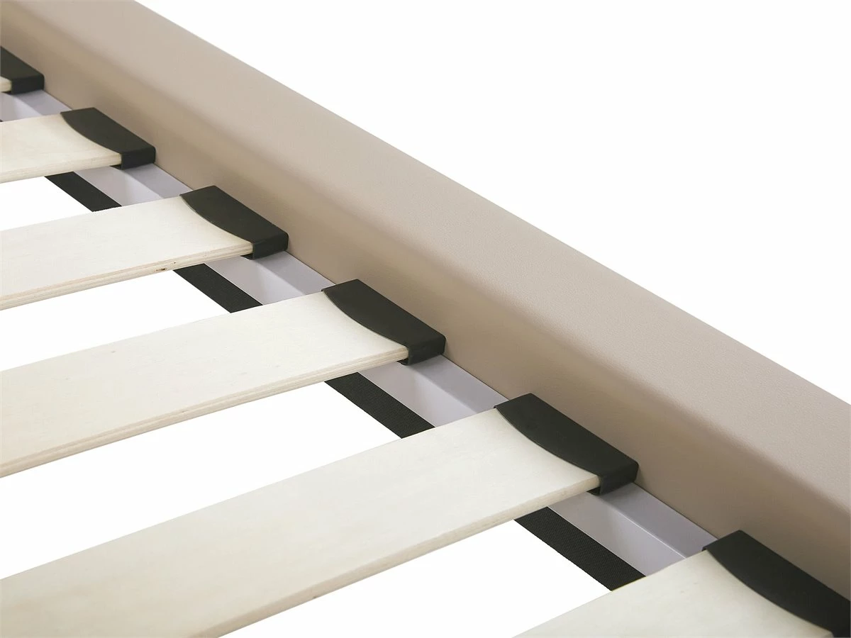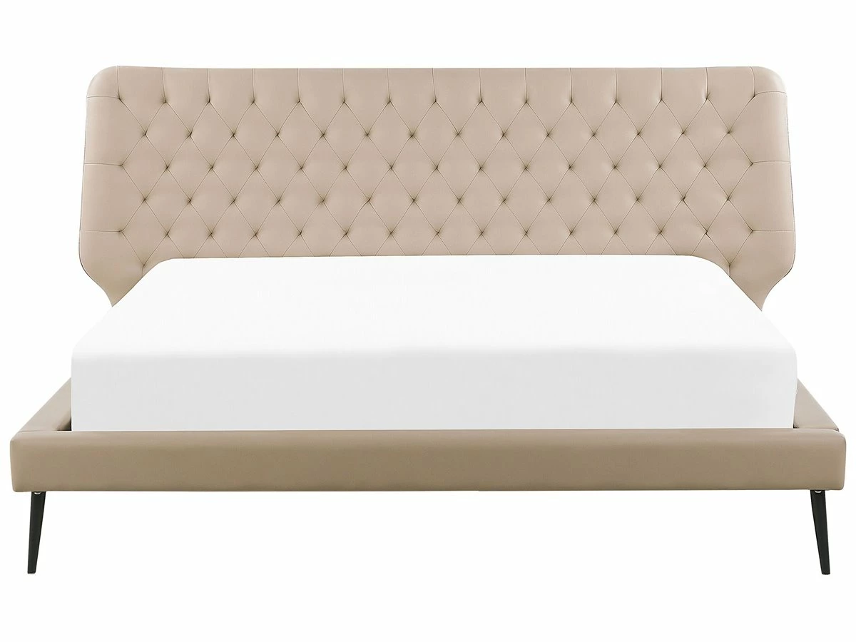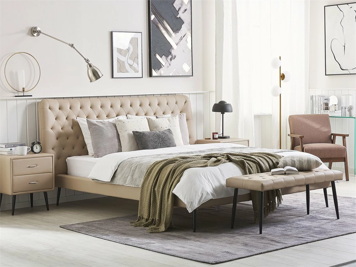 Cama de diseño moderno. Añade modernidad a tu dormitorio con esta cama con somier. Está fabricada a partir de piel sintética de alta calidad y bajo mantenimiento. El somier de listones garantiza un sueño saludable y una distribución uniforme del peso corporal. El cabecero capitoné aporta un toque de distinción. Detalles: Tipo de Producto: Cama matrimonial Estilo: Moderno Color: Beige Tipo de material: Piel sintética Material principal: Piel sintética Material adicional: Metal Composición del Material: 100% Poliéster Parte posterior tapizada: No Dimensiones: Dimensiones del reposacabezas: 228×88 Ancho: 228 cm Longitud: 219 cm Altura: 108 cm Superficie para dormir: 180×200 cm Peso: 55 kg Capacidad de peso: 350 kg La oferta incluye: 1 x Estructura de cama, 1 x Somier (39 listones flexibles, No incluye: colchón y ropa de cama Ventajas: La base de listones que absorbe los golpes proporciona un soporte perfecto, Espaciosa superficie para dormir, Crea un ambiente acogedor, Con un clásico mechón decorativo, Estructura duradera y sólida Información de montaje: Requiere montaje completo. 20-40 min. Información adicional: La altura del colchón visible en la imagen es de 20 cm. Consejos de mantenimiento: Piel sintética: 1.Use solo limpiadores suaves y acondicionadores dedicados a la piel sintética, 2.Limpie con agua destilada y use limpiadores a base de jabón en las manchas difíciles 3.Aspire con un accesorio adecuado 4.Una vez a la semana, limpie con un paño húmedo y seque después. No engrasar Metal: 1.Para evitar arañazos, no use limpiadores abrasivos 2.Limpie con un limpiador y un paño suave, seque después 3.Para elementos de cobre o cromados, use agente abrillantador.