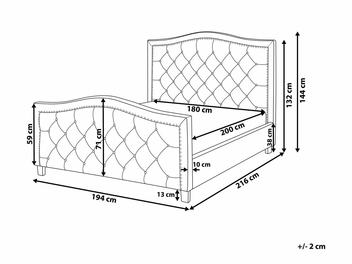 Cama de diseño glamuroso. Añade un toque vintage a tu dormitorio con esta cama con somier. Está fabricada a partir de tela de poliéster de alta calidad. El somier de listones garantiza un sueño saludable y una distribución uniforme del peso. Los botones decorativos y las tachuelas en el cabecero y el pie de cama aportan una cierta nota de glamour. Detalles: Tipo de Producto: Cama matrimonial Estilo: Retro Color: Beige Tipo de material: Tejido Material principal: Poliéster Material adicional: Madera de pino Composición del Material: 100% Poliéster Parte posterior tapizada: No Dimensiones: Dimensiones del reposacabezas: 194×131 Ancho: 194 cm Longitud: 216 cm Altura: 144 cm Superficie para dormir: 180×200 cm Peso: 68 kg Capacidad de peso: 300 kg La oferta incluye: 1 x Somier (45 listones flexibles, 1 x Estructura de cama, No incluye: colchón y ropa de cama Ventajas: La base de listones que absorbe los golpes proporciona un soporte perfecto, Espaciosa superficie para dormir, Acabado con remaches que enfatizan la forma del mueble, Diseño elegante, Acolchado con botones decorativos, Acolchado de alta calidad Información de montaje: Requiere montaje completo. 20-40 min. Información adicional: La altura del colchón visible en la imagen es de 20 cm. Consejos de mantenimiento: Poliéster: 1.Limpiar con champú seco y una esponja húmeda o un limpiador suave 2.Aspire con un accesorio adecuado. Madera de pino: 1.Limpie con un limpiador y un paño suave en la dirección del grano 2.Los muebles con acabado de aceite deben engrasarse una vez al año, 3.Seque inmediatamente después de limpiar. para evitar que se acumule agua en los muebles.