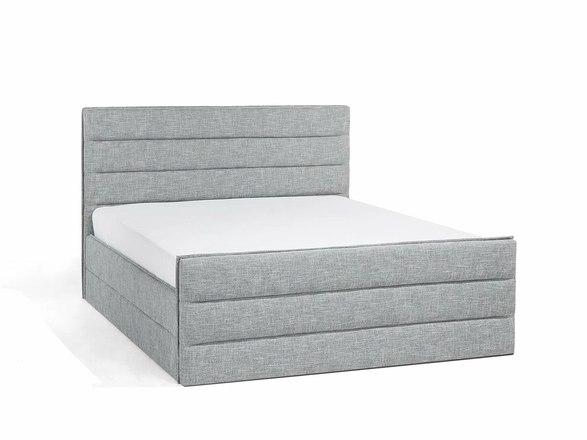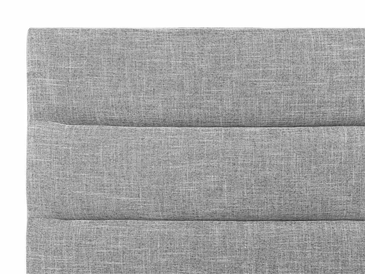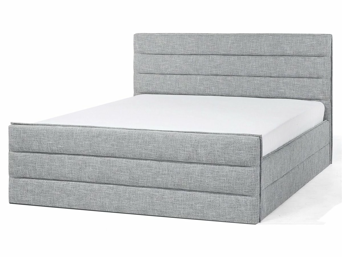 Cama de diseño moderno. Añade elegancia y funcionalidad a tu dormitorio con esta cama con somier. Está fabricada a partir de tela de poliéster de alta calidad. Las líneas horizontales en el cabecero y en el pie de cama aportan un toque de modernidad. El estilo definido combina bien con cualquier interior. Detalles: Tipo de Producto: Cama matrimonial Estilo: Moderno Color: Gris Tonalidad: Gris claro Tipo de material: Tejido Material principal: Poliéster Material adicional: Material sintético Composición del Material: 85% Poliéster Parte posterior tapizada: No Dimensiones: Dimensiones del reposacabezas: 171×114 Ancho: 216 cm Longitud: 171 cm Altura: 114 cm Superficie para dormir: 160×200 cm Peso: 52 kg Capacidad de peso: 300 kg La oferta incluye: 1 x Estructura de cama, 1 x Somier (26 listones flexibles, No incluye: colchón y ropa de cama Ventajas: Espaciosa superficie para dormir, Ideal para todo tipo de decoración, Diseño moderno, Acolchado de alta calidad, No requiere mantenimiento regular, Estructura duradera y sólida Información de montaje: Requiere montaje completo. 20-40 min. Información adicional: La altura del colchón visible en la imagen es de 20 cm. Consejos de mantenimiento: Poliéster: 1.Limpiar con champú seco y una esponja húmeda o un limpiador suave 2.Aspire con un accesorio adecuado.