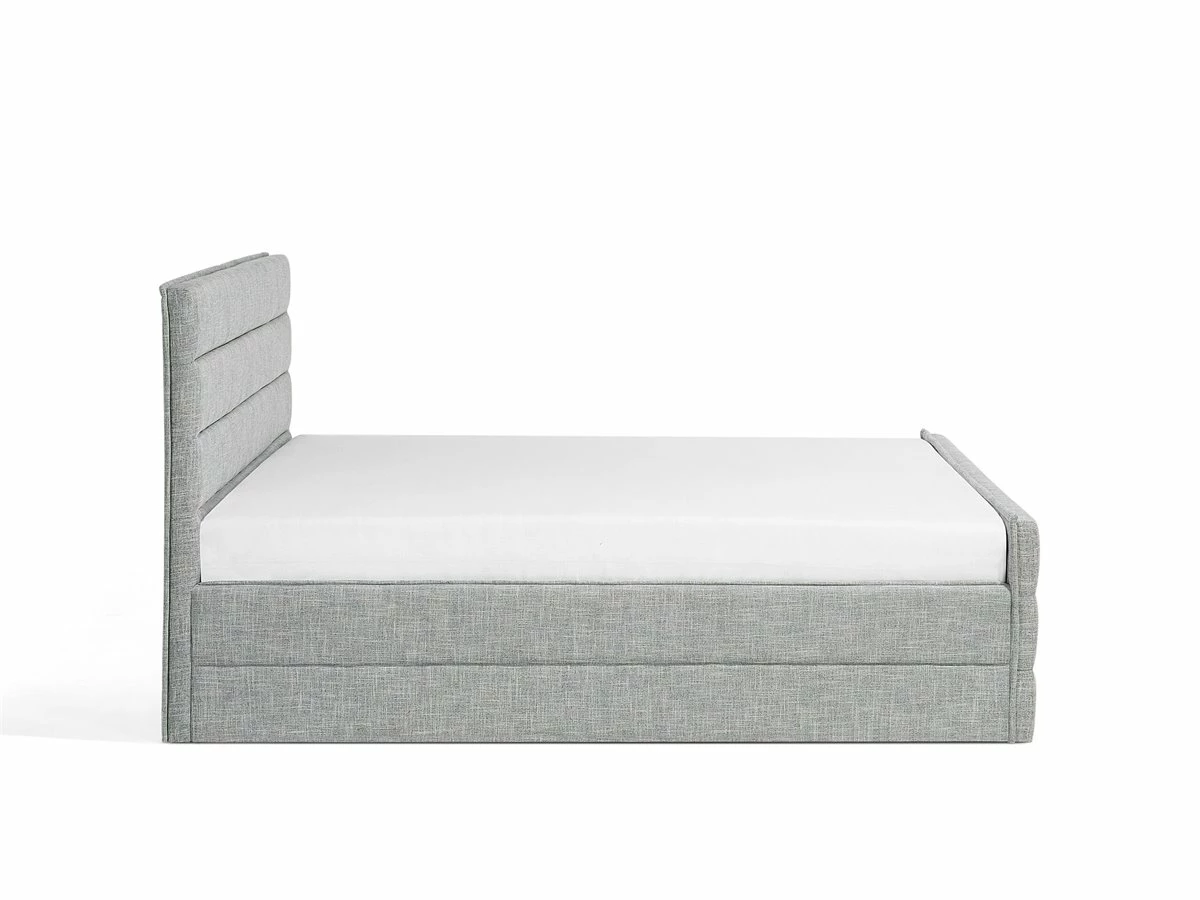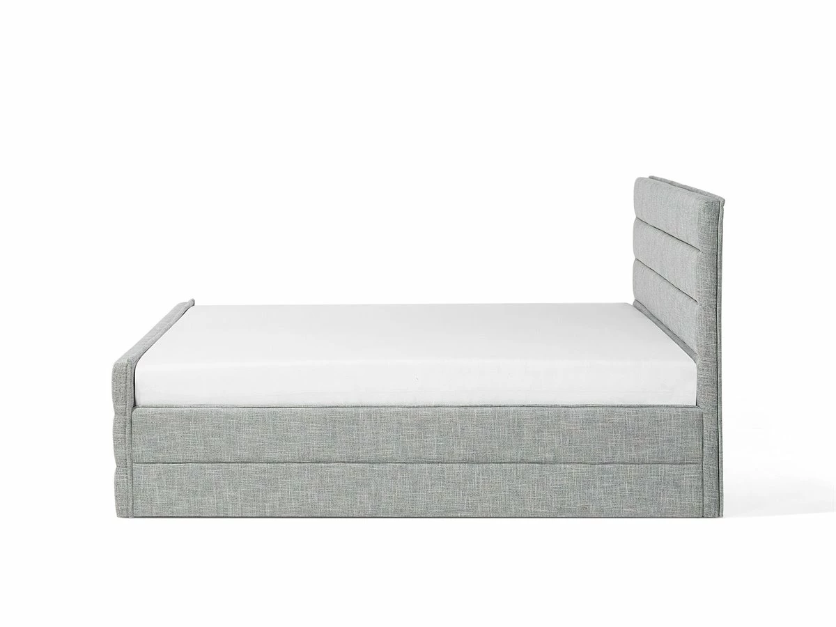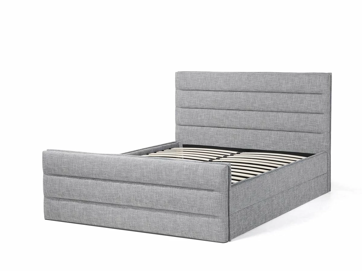 Cama de diseño moderno. Añade elegancia y funcionalidad a tu dormitorio con esta cama con somier. Está fabricada a partir de tela de poliéster de alta calidad. Las líneas horizontales en el cabecero y en el pie de cama aportan un toque de modernidad. El estilo definido combina bien con cualquier interior. Detalles: Tipo de Producto: Cama matrimonial Estilo: Moderno Color: Gris Tonalidad: Gris claro Tipo de material: Tejido Material principal: Poliéster Material adicional: Material sintético Composición del Material: 85% Poliéster Parte posterior tapizada: No Dimensiones: Dimensiones del reposacabezas: 171×114 Ancho: 216 cm Longitud: 171 cm Altura: 114 cm Superficie para dormir: 160×200 cm Peso: 52 kg Capacidad de peso: 300 kg La oferta incluye: 1 x Estructura de cama, 1 x Somier (26 listones flexibles, No incluye: colchón y ropa de cama Ventajas: Espaciosa superficie para dormir, Ideal para todo tipo de decoración, Diseño moderno, Acolchado de alta calidad, No requiere mantenimiento regular, Estructura duradera y sólida Información de montaje: Requiere montaje completo. 20-40 min. Información adicional: La altura del colchón visible en la imagen es de 20 cm. Consejos de mantenimiento: Poliéster: 1.Limpiar con champú seco y una esponja húmeda o un limpiador suave 2.Aspire con un accesorio adecuado.