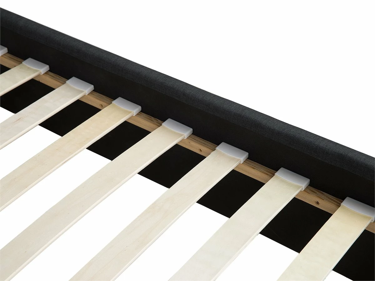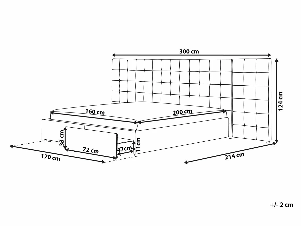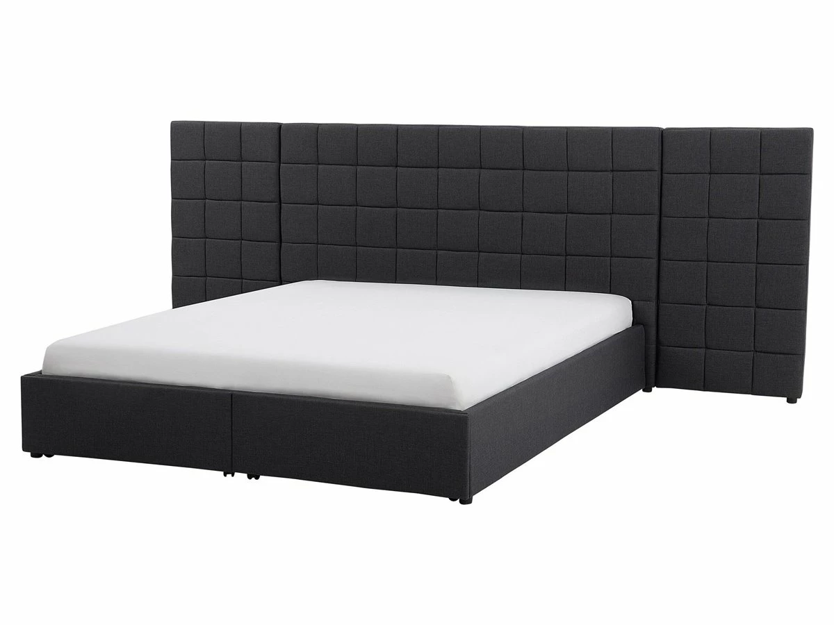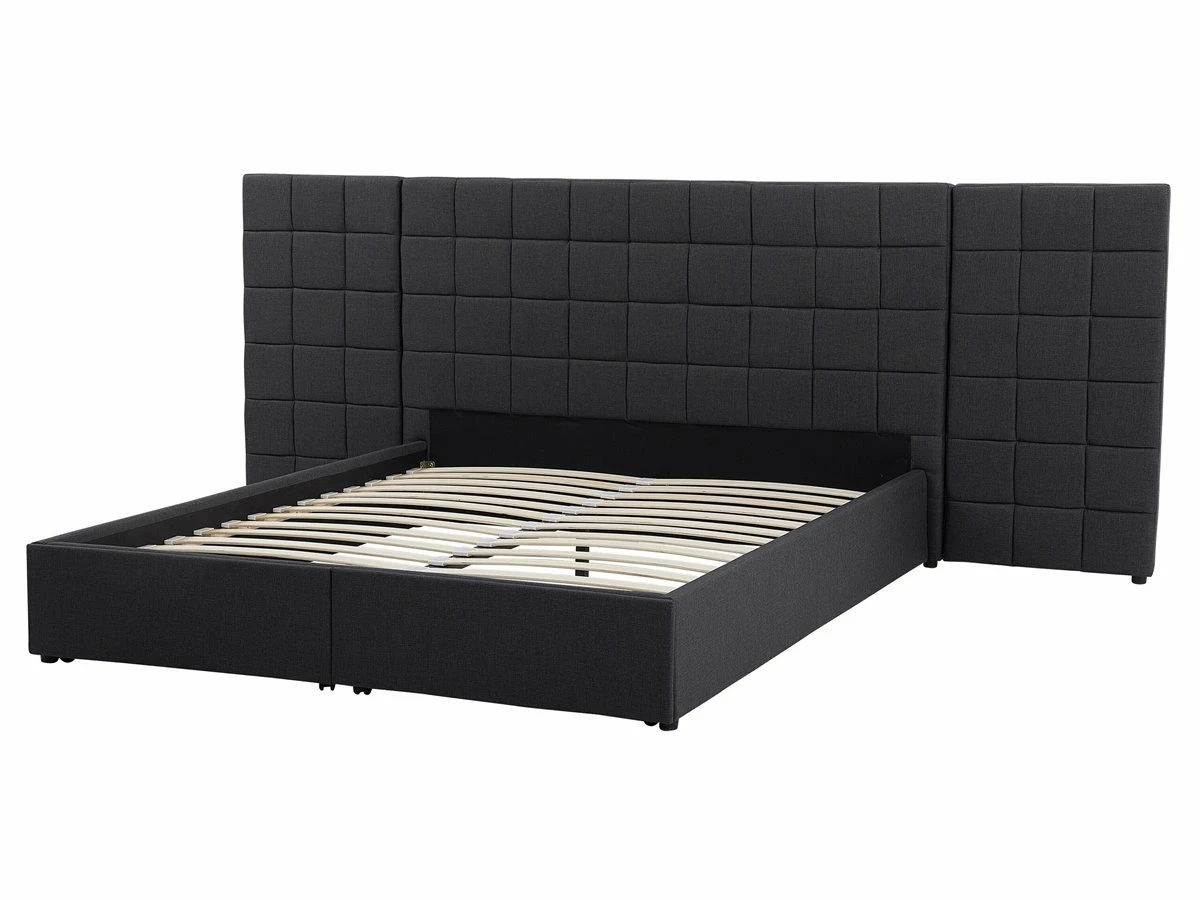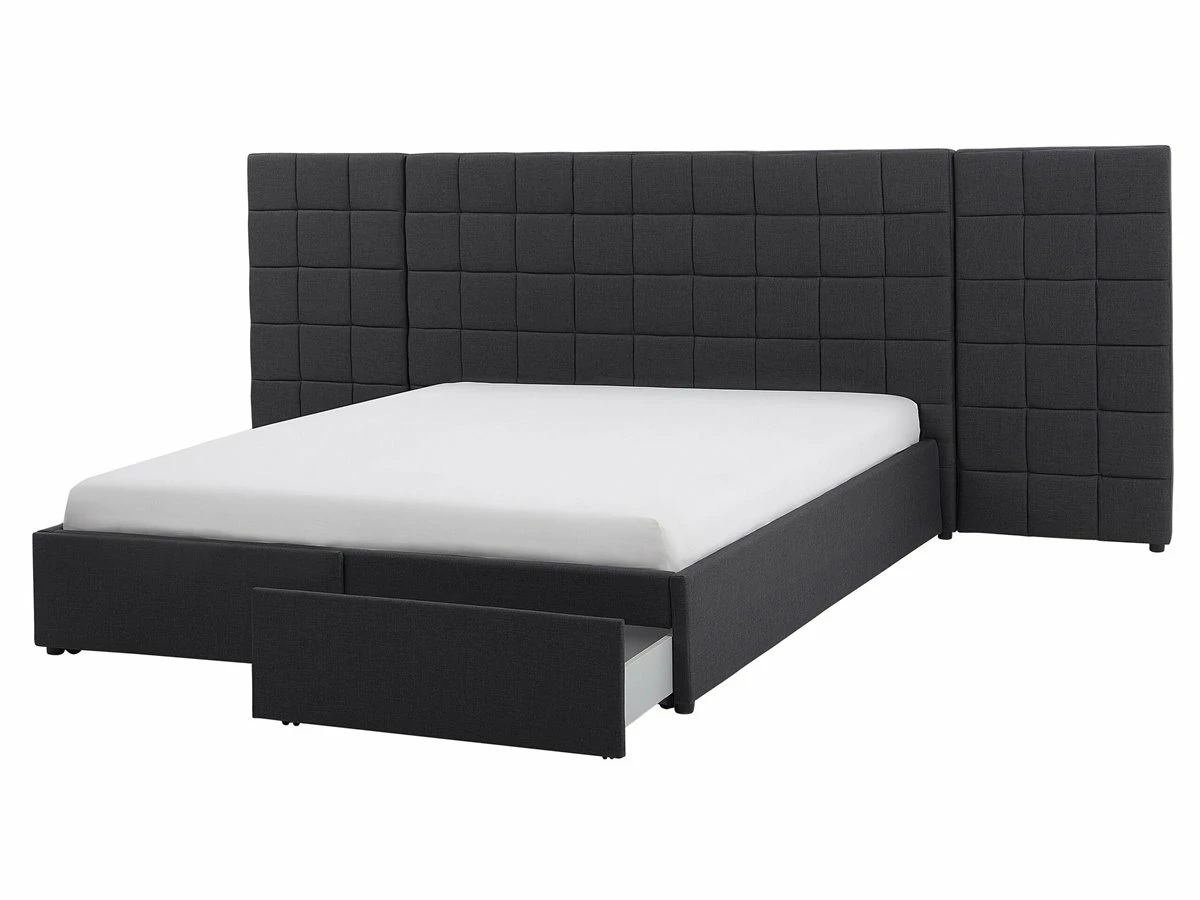 Cama de diseño moderno. Añade modernidad a tu dormitorio con esta cama con somier. Está fabricada a partir de tela de poliéster de alta calidad. El somier de listones garantiza un sueño saludable y una distribución uniforme del peso corporal. El cabecero de gran tamaño llama poderosamente la atención. Incluye un espacio de almacenaje donde guardar la ropa de cama. Detalles: Tipo de Producto: Cama matrimonial Estilo: Moderno Color: Gris Tonalidad: Gris oscuro Tipo de material: Tejido Material principal: Poliéster Material adicional: Material sintético Material del almacenamiento: Tablero de fibra Composición del Material: 100% Poliéster Parte posterior tapizada: No Tipo de almacenamiento: Cajones Almacenamiento: Sí Dimensiones: Dimensiones del reposacabezas: 300×124 Ancho: 300 cm Longitud: 214 cm Altura: 124 cm Superficie para dormir: 160×200 cm Peso: 81 kg Capacidad de peso: 220 kg La oferta incluye: 2 x Cajón de almacenaje, 1 x Estructura de cama, 1 x Somier (28 listones flexibles, No incluye: colchón y ropa de cama Ventajas: Cajones con estable mecanismo de abertura, Diseño moderno, Combina con todo tipo de decoración, Construcción muy estable, Acolchado de alta calidad, Espacio de almacenamiento funcional Información de montaje: Requiere montaje completo. 45-60 min. Información adicional: La altura del colchón visible en la imagen es de 20 cm. Consejos de mantenimiento: Poliéster: 1.Aspire con un accesorio adecuado 2.Limpiar con champú seco y una esponja húmeda o un limpiador suave.