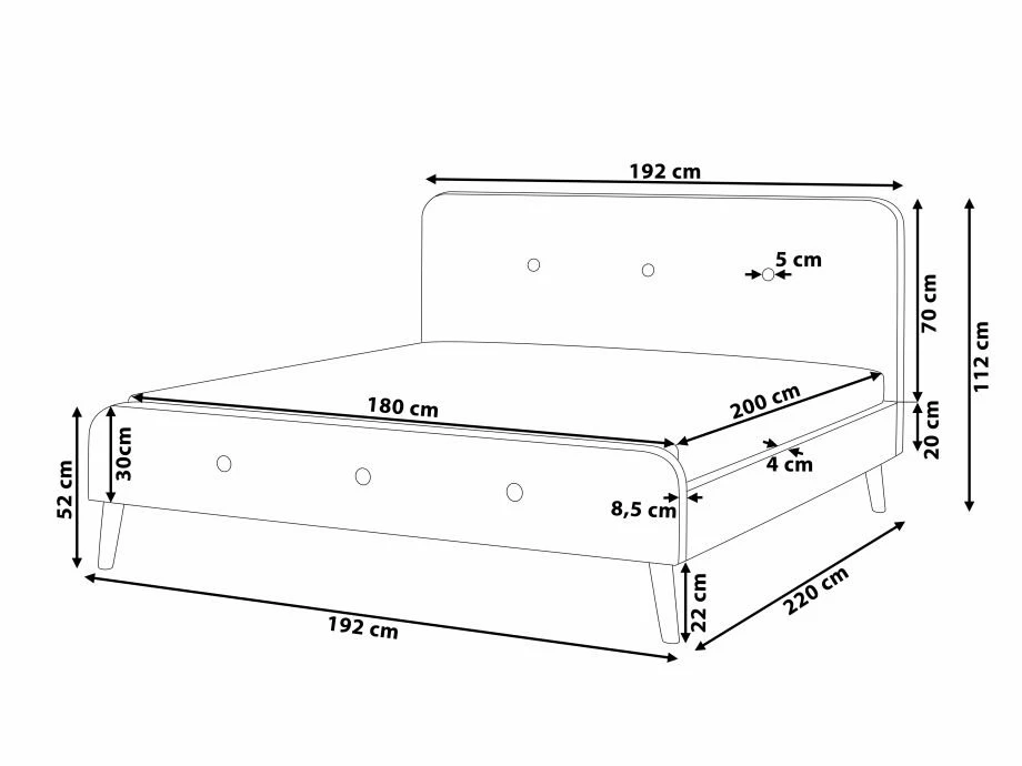Cama de diseño moderno. Añade comodidad y un estilo definido a tu dormitorio con esta cama con somier. Está fabricada a partir de tela de poliéster de alta calidad. Los botones decorativos en cabecero y pie de cama aportan un toque de distinción. Detalles: Tipo de Producto: Cama matrimonial Estilo: Retro Color: Gris Tonalidad: Gris oscuro Tipo de material: Tejido Material principal: Poliéster Material adicional: Poliéster Composición del Material: 100% Poliéster Parte posterior tapizada: No Dimensiones: Dimensiones del reposacabezas: 192×90 Ancho: 192 cm Longitud: 220 cm Altura: 112 cm Superficie para dormir: 180×200 cm Peso: 50 kg Capacidad de peso: 300 kg La oferta incluye: 1 x Estructura de cama, 1 x Somier (26 listones flexibles, No incluye: colchón y ropa de cama Ventajas: Muy cómodo, Diseño elegante, Acolchado de alta calidad, Estructura duradera y sólida, Mantenimiento sencillo Información de montaje: Requiere montaje completo. 45-60 min. Información adicional: La altura del colchón visible en la imagen es de 20 cm. Consejos de mantenimiento: Poliéster: 1.Limpiar con champú seco y una esponja húmeda o un limpiador suave 2.Aspire con un accesorio adecuado. Madera: 1.Limpie con un limpiador y un paño suave en la dirección del grano 2.Los muebles con acabado de aceite deben engrasarse una vez al año, 3.Seque inmediatamente después de limpiar. para evitar que se acumule agua en los muebles.