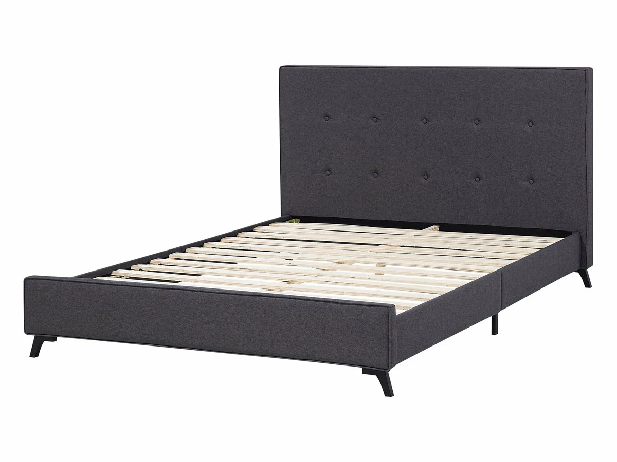 Cama de diseño moderno. Añade a tu dormitorio esta cama con somier inspirada en el diseño escandinavo. Está fabricada a partir de tela de poliéster de alta calidad y suave al tacto. La estructura y las patas de madera ofrecen estabilidad y comodidad. Los botones decorativos aportan un cierto toque sofisticado al estilo. Detalles: Tipo de Producto: Cama matrimonial Estilo: Tradicional Color: Gris Tonalidad: Gris oscuro Tipo de material: Tejido Material principal: Poliéster Material adicional: Madera de caucho Composición del Material: 100% Poliéster Parte posterior tapizada: No Dimensiones: Dimensiones del reposacabezas: 152×96 Ancho: 152 cm Longitud: 216 cm Altura: 106 cm Superficie para dormir: 140×200 cm Peso: 42 kg Capacidad de peso: 200 kg La oferta incluye: 1 x Somier de láminas (26 listones curvados, 1 x Estructura de cama, No incluye: colchón y ropa de cama Ventajas: Apto para cualquier tipo de colchón, Diseño atemporal, Combina con todo tipo de decoración, Acolchado de alta calidad, Estructura duradera y sólida Información de montaje: Requiere montaje completo. 20-40 min. Información adicional: La altura del colchón visible en la imagen es de 20 cm. Consejos de mantenimiento: Poliéster: 1.Aspire con un accesorio adecuado 2.Limpiar con champú seco y una esponja húmeda o un limpiador suave. Madera: 1.Los muebles con acabado de aceite deben engrasarse una vez al año, 2.Seque inmediatamente después de limpiar. para evitar que se acumule agua en los muebles 3.Limpie con un limpiador y un paño suave en la dirección del grano.