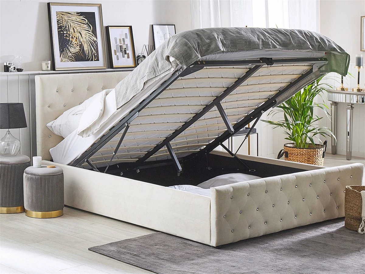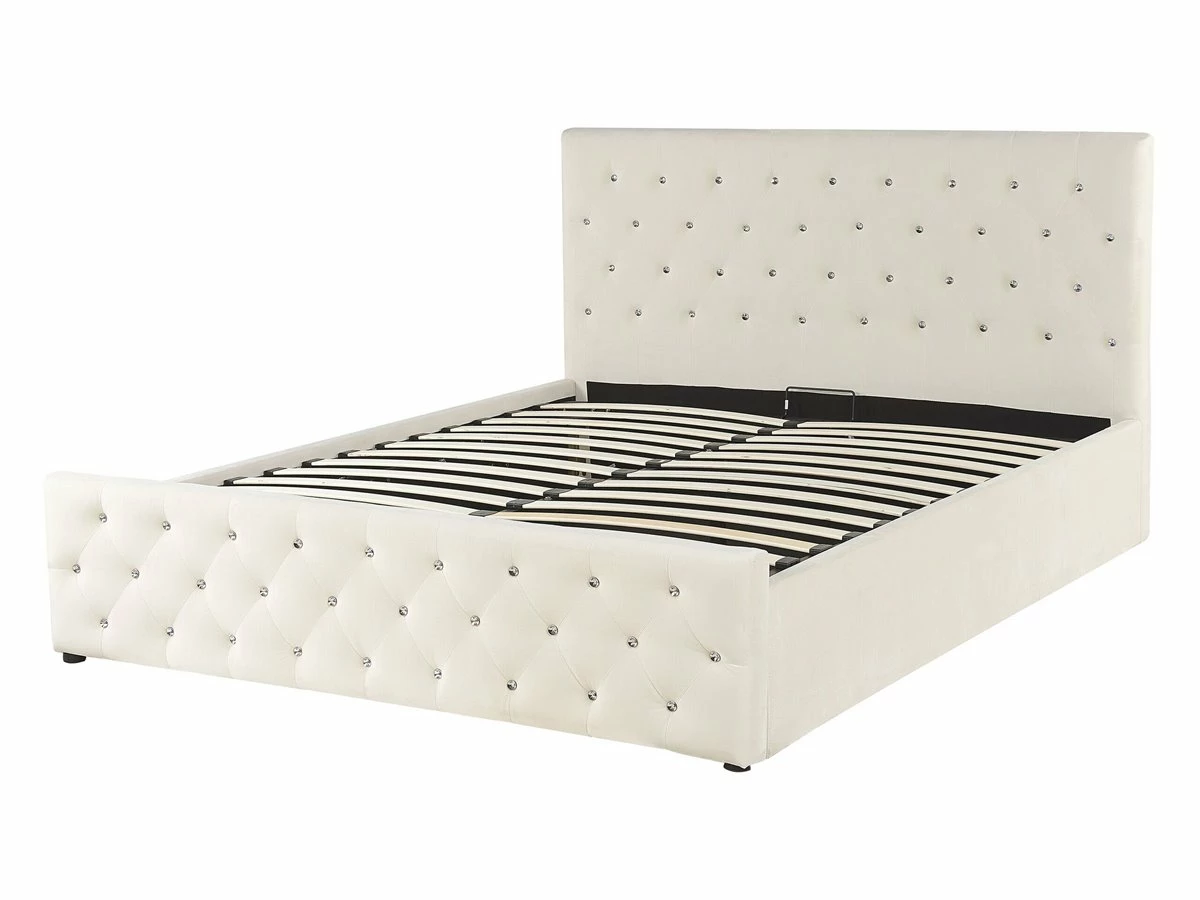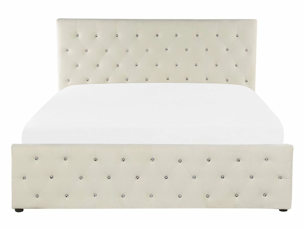 Cama con almacenaje. Añade un toque elegante a tu dormitorio con esta cama con somier. Está fabricada a partir de terciopelo de alta calidad y suave al tacto. Las tachuelas decorativas y los cristales de imitación en el cabecero y el pie de cama aportan una cierta nota de glamour. Incluye un espacio de almacenaje donde guardar la ropa de cama. Detalles: Tipo de Producto: Cama matrimonial Estilo: Moderno Color: Beige Tonalidad: Beige claro Tipo de material: Poliéster aterciopelado Material principal: Terciopelo Material adicional: Material sintético Material del almacenamiento: Tela no tejida Composición del Material: 100% Poliéster Parte posterior tapizada: No Tipo de almacenamiento: Elevado Almacenamiento: Sí Dimensiones: Dimensiones del reposacabezas: 151×109 Ancho: 151 cm Dimensiones del almacenamiento: 142×202 Longitud: 217 cm Altura: 109 cm Superficie para dormir: 140×200 cm Peso: 45 kg Capacidad de peso: 200 kg La oferta incluye: 1 x Marco de cama con almacenamiento, 1 x Somier (24 listones flexibles, No incluye: colchón y ropa de cama Ventajas: La base de listones que absorbe los golpes proporciona un soporte perfecto, El marco integrado garantiza la máxima estabilización, Aspecto elegante estilo Chesterfield, Acolchado con botones decorativos, Construcción muy estable, Tejido aterciopelado suave como la seda, Espacio de almacenamiento funcional Información de montaje: Requiere montaje completo. 45-60 min. Información adicional: La altura del colchón visible en la imagen es de 20 cm. Tenga en cuenta que la tela de terciopelo puede verse un poco diferente cuando se expone a una iluminación diferente: tiende a brillar más a la luz del día y parece más atenuada en la iluminación artificial interior. Debido a la estructura suave de alta densidad, el tono de la tela de terciopelo también puede variar cuando se pasa la mano en diferentes direcciones y ángulos. Para igualar el color y eliminar las arrugas, el material debe limpiarse con la palma de mano abierta en una dirección, limpiarse con un paño húmedo o una plancha con vapor. Consejos de mantenimiento: Terciopelo: 1.Aspire con un accesorio adecuado 2.Limpiar con champú seco y una esponja húmeda o un limpiador suave.