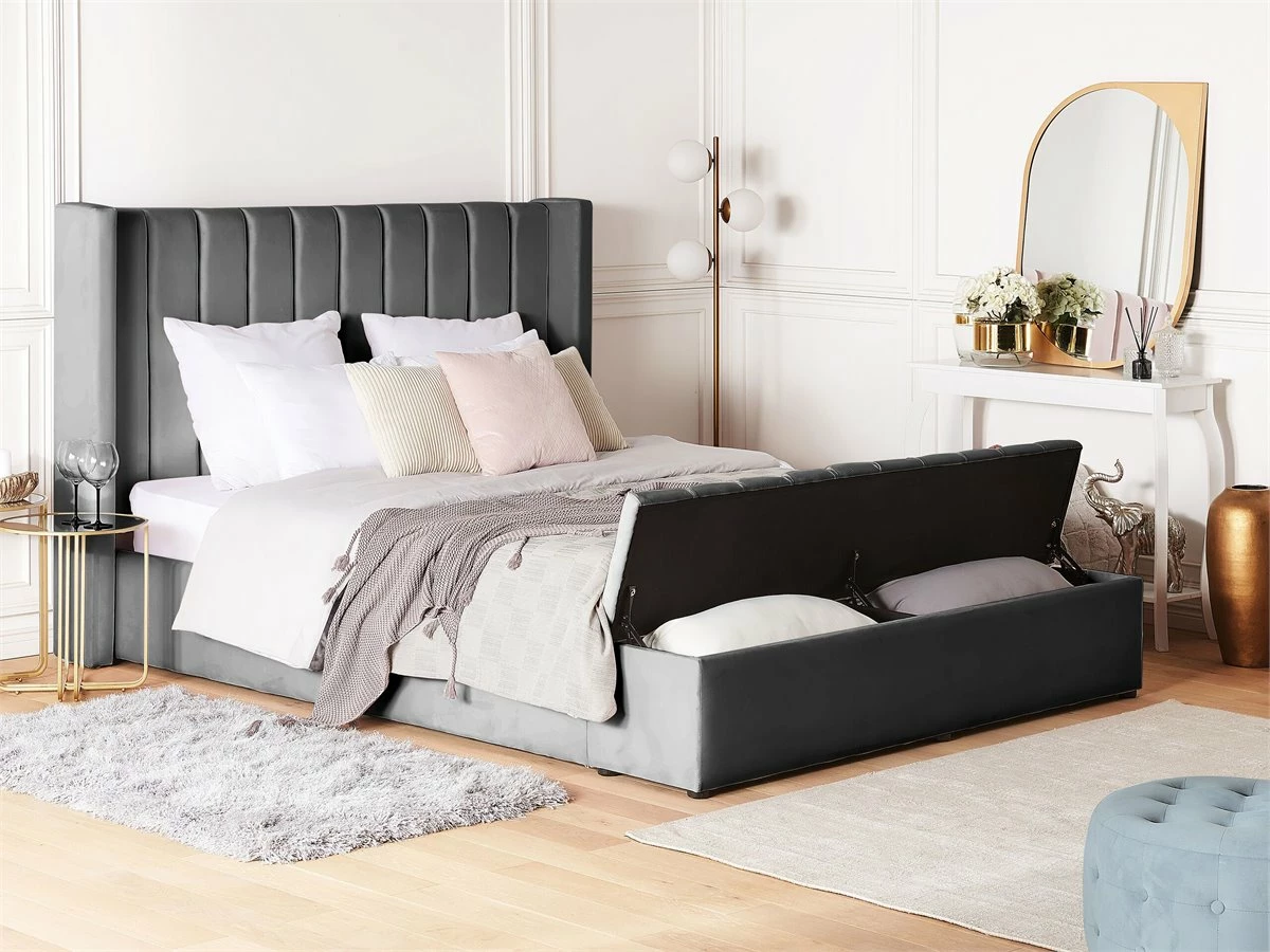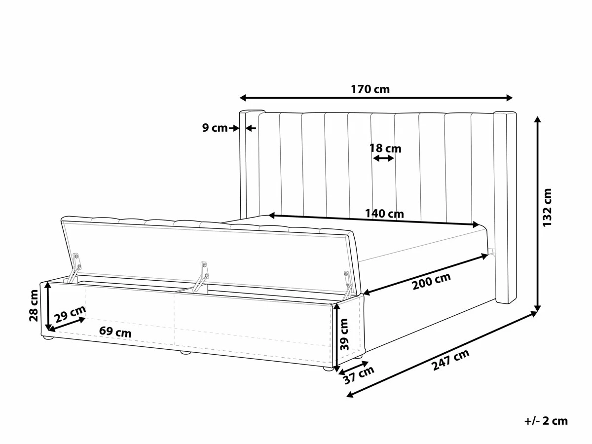 Cama con almacenaje. Esta cama con somier combina bien en cualquier dormitorio moderno o tradicional. Está fabricada a partir de terciopelo de alta calidad. El cabecero acolchado de diseño capitoné ofrece la mayor comodidad para leer un libro o ver la TV. Incluye un banco que puedes utilizar como asiento adicional o para guardar la ropa de cama. Detalles: Tipo de Producto: Cama matrimonial Estilo: Moderno Color: Negro Tipo de material: Poliéster aterciopelado Material principal: Terciopelo Material adicional: Madera de pino Material del almacenamiento: Madera Composición del Material: 100% Poliéster Parte posterior tapizada: No Tipo de almacenamiento: Banco con almacenaje Almacenamiento: Sí Dimensiones: Dimensiones del reposacabezas: 170×132 Ancho: 170 cm Dimensiones del almacenamiento: 69x29x28 Longitud: 247 cm Altura: 132 cm Superficie para dormir: 140×200 cm Peso: 74 kg Capacidad de peso: 250 kg La oferta incluye: 1 x Somier (30 listones flexibles, 1 x Estructura de cama, 1 x Caja baúl, No incluye: colchón y ropa de cama Ventajas: El marco integrado garantiza la máxima estabilización, Banco con almacenamiento espacioso y funcional, Diseño atemporal, Fabricación sólida y precisa, Tejido aterciopelado suave como la seda Información de montaje: Requiere montaje completo. 45-60 min. Información adicional: La altura del colchón visible en la imagen es de 20 cm. Tenga en cuenta que el banco es una parte integral de la cama y, por lo tanto, no se puede separar de ella. Tenga en cuenta que la tela de terciopelo puede verse un poco diferente cuando se expone a una iluminación diferente: tiende a brillar más a la luz del día y parece más atenuada en la iluminación artificial interior. Debido a la estructura suave de alta densidad, el tono de la tela de terciopelo también puede variar cuando se pasa la mano en diferentes direcciones y ángulos. Para igualar el color y eliminar las arrugas, el material debe limpiarse con la palma de mano abierta en una dirección, limpiarse con un paño húmedo o una plancha con vapor. Consejos de mantenimiento: Terciopelo: 1.Limpiar con champú seco y una esponja húmeda o un limpiador suave 2.Aspire con un accesorio adecuado.