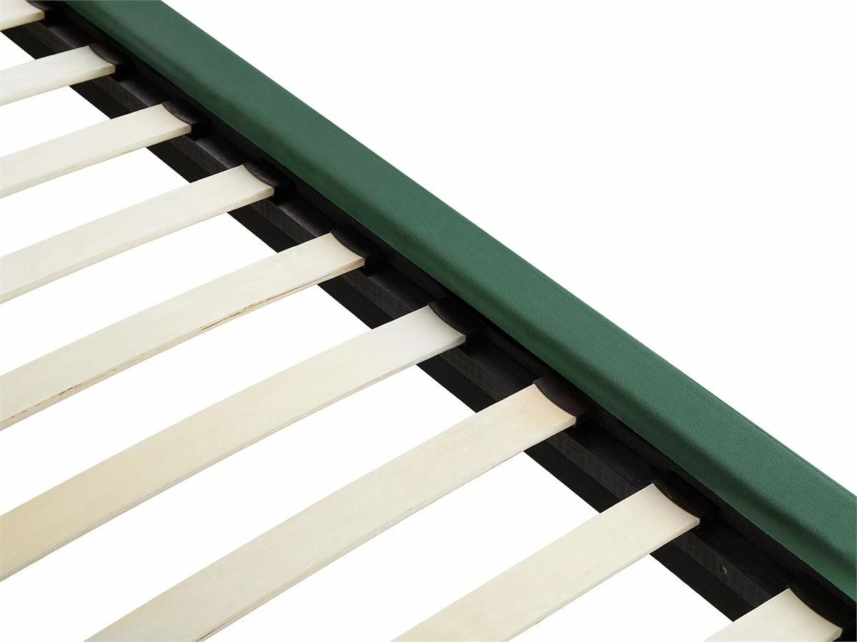 Cama de diseño moderno. Añade elegancia a tu dormitorio con esta cama con somier de diseño contemporáneo. Está fabricada a partir de terciopelo de alta calidad. El cabecero acolchado con forma de almohada aporta exclusividad en el diseño. Las patas de tamaño reducido garantizan resistencia y estabilidad. Detalles: Tipo de Producto: Cama matrimonial Estilo: Moderno Color: Verde Tonalidad: Verde esmeralda Tipo de material: Poliéster aterciopelado Material principal: Terciopelo Material adicional: Hierro Composición del Material: 100% Poliéster Parte posterior tapizada: No Dimensiones: Dimensiones del reposacabezas: 166×82 Ancho: 176 cm Longitud: 228 cm Altura: 95 cm Superficie para dormir: 160×200 cm Peso: 43 kg Capacidad de peso: 250 kg La oferta incluye: 1 x Estructura de cama, 1 x Somier (26 listones flexibles, No incluye: colchón y ropa de cama Ventajas: Apto para cualquier tipo de colchón, Combina con todo tipo de decoración, Acolchado de alta calidad, Estructura duradera y sólida, Cojines de respaldo con fundas extraíbles Información de montaje: Requiere montaje completo. 45-60 min. Información adicional: La altura del colchón visible en la imagen es de 20 cm. Tenga en cuenta que la tela de terciopelo puede verse un poco diferente cuando se expone a una iluminación diferente: tiende a brillar más a la luz del día y parece más atenuada en la iluminación artificial interior. Debido a la estructura suave de alta densidad, el tono de la tela de terciopelo también puede variar cuando se pasa la mano en diferentes direcciones y ángulos. Para igualar el color y eliminar las arrugas, el material debe limpiarse con la palma de mano abierta en una dirección, limpiarse con un paño húmedo o una plancha con vapor. Consejos de mantenimiento: Terciopelo: 1.Aspire con un accesorio adecuado 2.Limpiar con champú seco y una esponja húmeda o un limpiador suave. Madera de álamo: 1.Los muebles con acabado de aceite deben engrasarse una vez al año, 2.Seque inmediatamente después de limpiar. para evitar que se acumule agua en los muebles 3.Limpie con un limpiador y un paño suave en la dirección del grano.