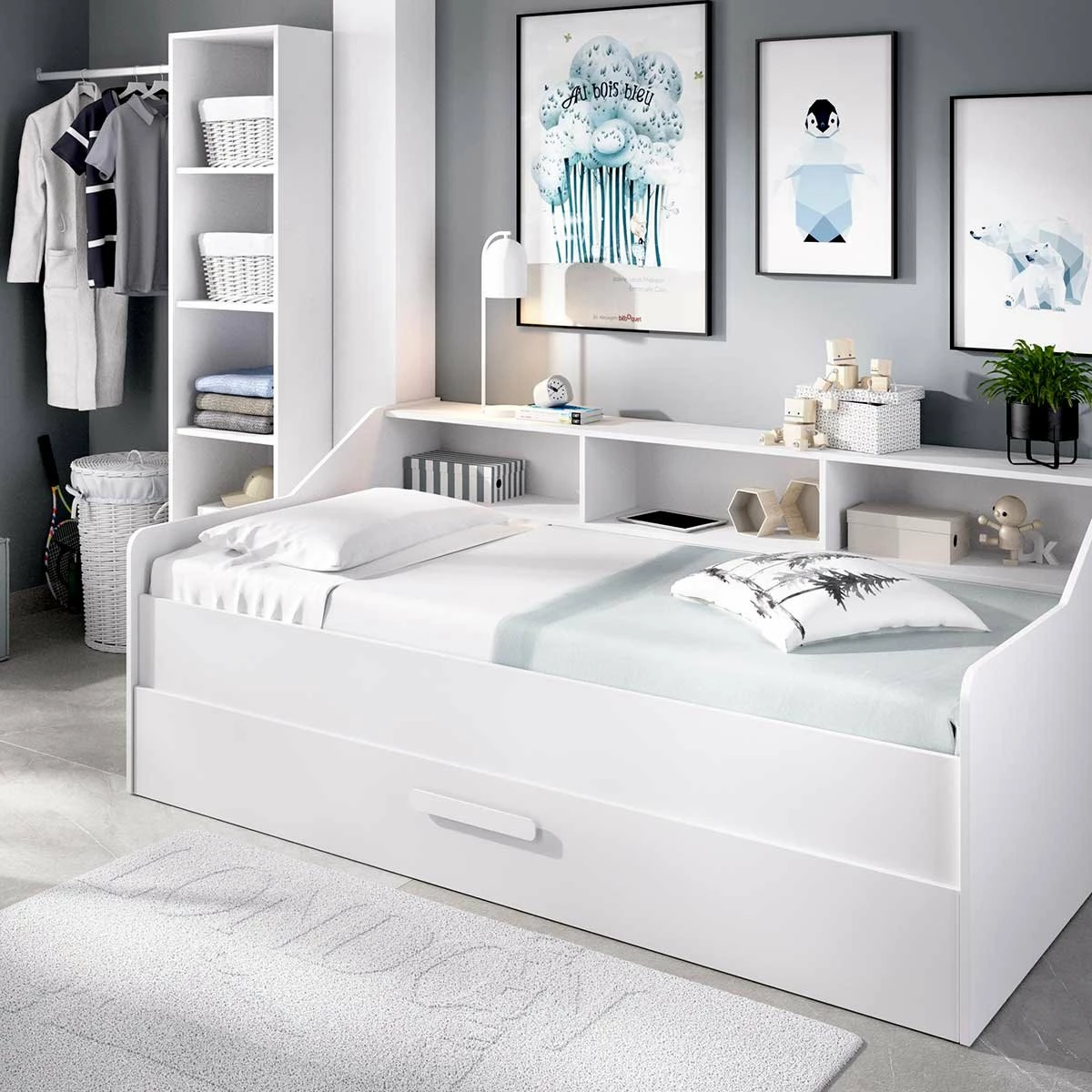 La cama nido Drag es práctica, tiene un diseño moderno y unosmateriales de calidad. Así es, este modelo está fabricado en melamina de buenacalidad, lo que nos asegura una gran resistencia al paso del tiempo. En la camaencontramos varias zonas: 1 cajón inferior con gran espacio de almacenaje, 1espacio para 1 colchón de 90 x 190 cm, 3 huecos de almacenaje sobre esta y 1repisa superior que pone la guinda a este fantástico mueble. De esta manera, estamos ante un mueble muyestético, funcional y fácil de montar que combinará sin problema con el resto delmobiliario del dormitorio. Es necesario somier. Además de cama, podrás utilizarla como lugar dondealmacenar prendas de ropa, así como otros elementos tanto decorativos comofuncionales. Ideal para dormitorios de tamaño pequeño y mediano, esta cama nidoDrag te encantará. ¡Hazte con la tuya!