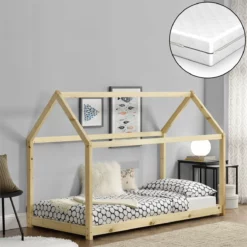 Cama Infantil Netstal Con Colchón Ortopédico – Forma De Casa – Pino 70 X 140 Cm – Natural [en.casa]