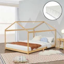 Cama Infantil Vindafjord En Forma De Casa Con Colchón Bambú 180 X 200 Cm – Color Natural [en.casa]
