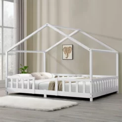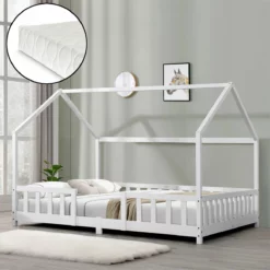 Cama Para Niños Sisimiut Forma De Casa Pino Con Colchón 140×200 Cm Blanco Mate [en.casa][neu.haus]