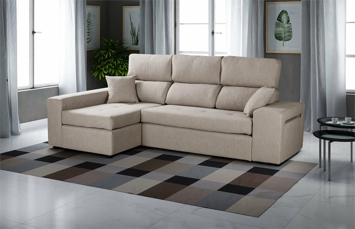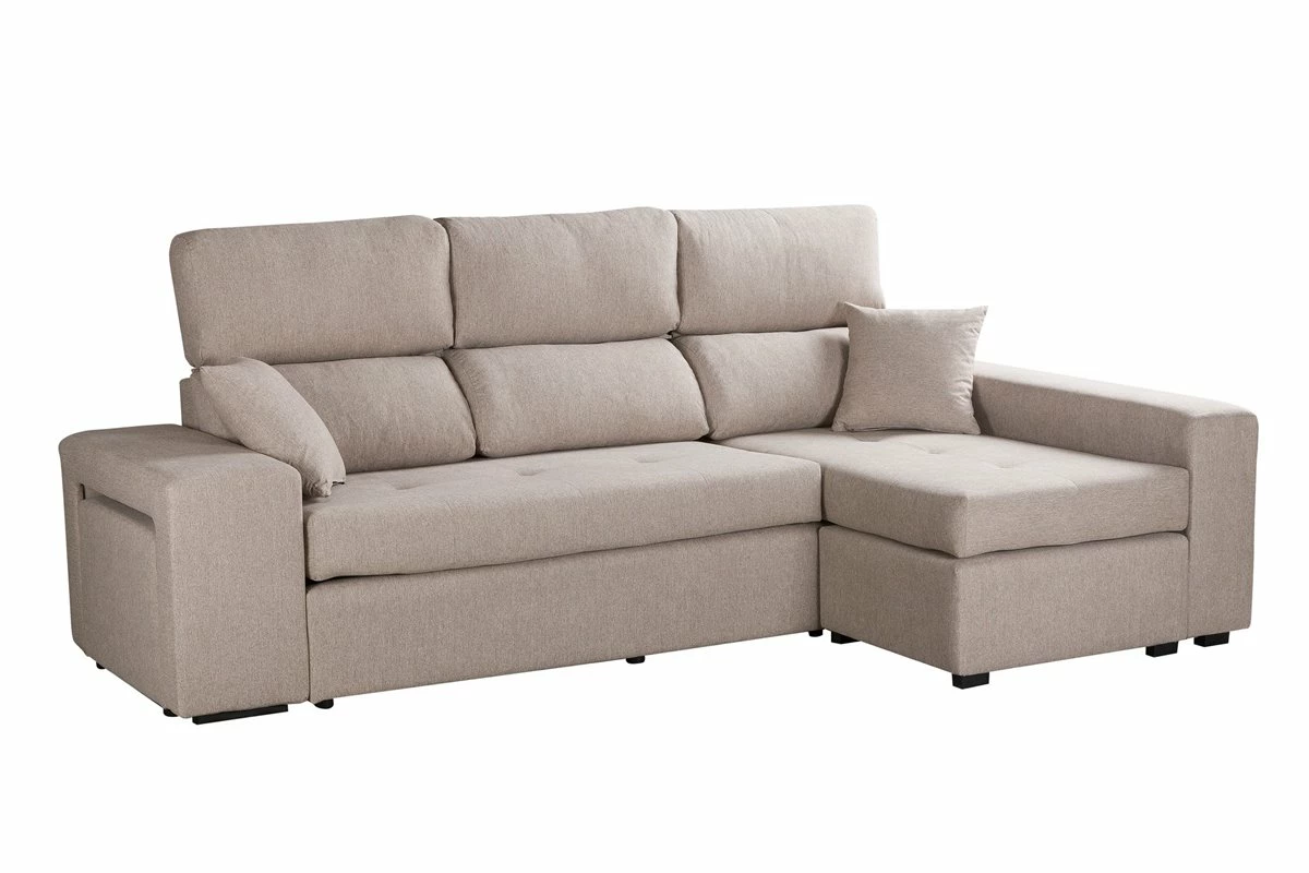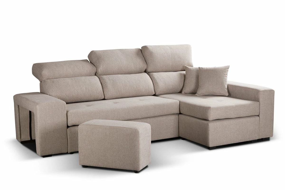Chaise Longue con 1 Pouf Integrados en el brazo y 2 cojines decorativos incluidos, color beige, patas de plástico y tipo de suspensión: Muelles Zig Zag.