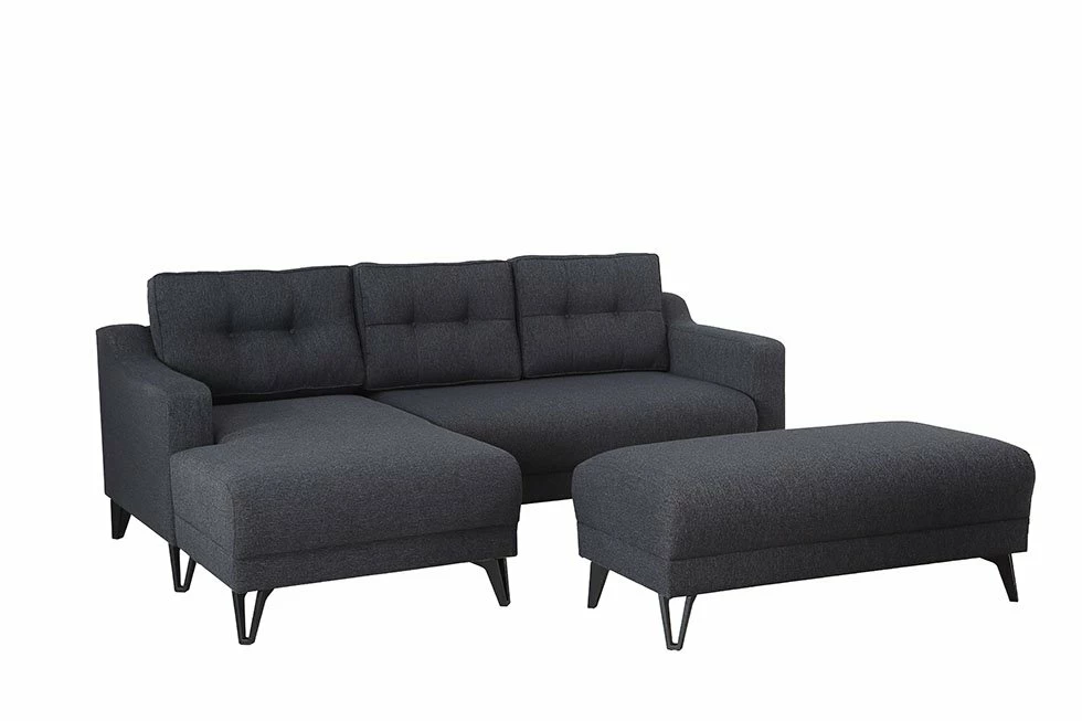 Chaise Longue y pouf*. Revestimiento tela 100 % Polyester. Estructura de madera contrachapada Tipo de suspensión: Muelles de metal. Patas de plástico.
