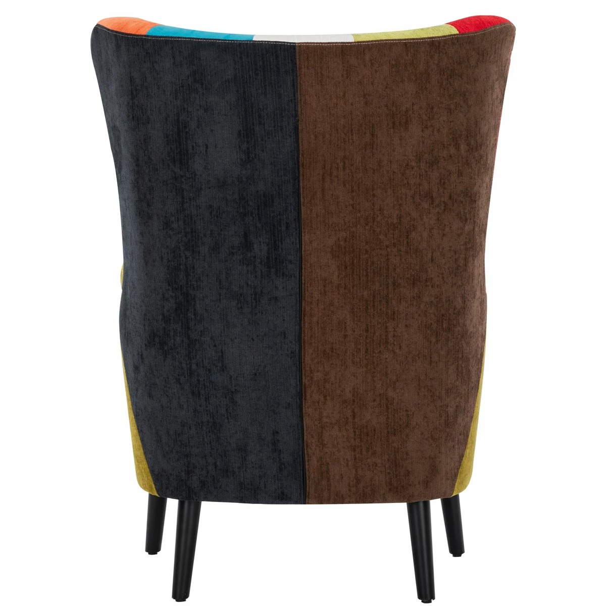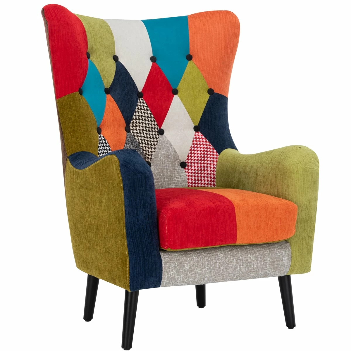 CIRCO Sillón. Tela estampado patchwork. Estructura de madera. Patas de madera, color negro. Medidas:76an x 110al x 80fon cm.