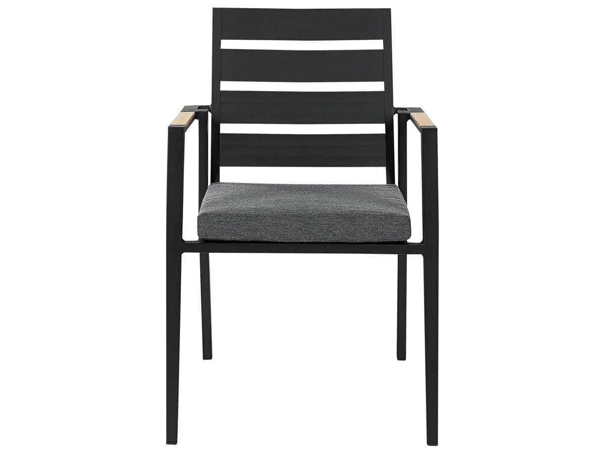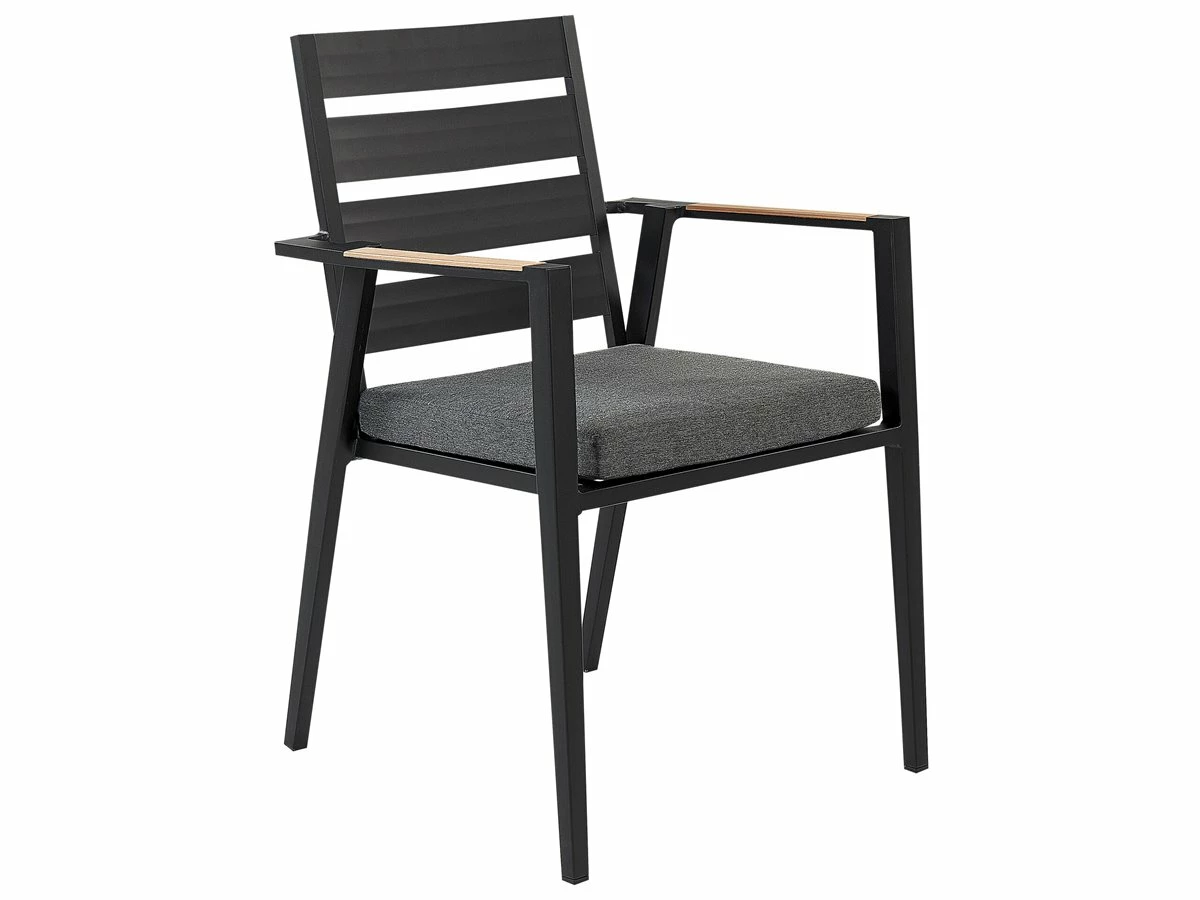 Juego de exterior. Añade elegancia a tu zona exterior con este conjunto de comedor. Está fabricado a partir de material duradero y de alta calidad. El respaldo de listones de la silla y los cojines gruesos aportan un aire de distinción. La forma geométrica de las patas de la mesa completa el diseño. Detalles: Tipo de Producto: Conjunto de comedor Estilo: Moderno Color: Negro Tipo de material: Material sintético Material principal: Aluminio Material adicional: Poliéster Composición del Material: 100% Poliéster Acabado: Revestimiento en polvo Densidad de espuma del asiento: 28 kg/m3 Dimensiones: Dimensiones de la silla: 49x54x86 cm Espesor del asiento: 5 cm Altura del asiento: 39 cm Dimensiones de la mesa: 110x110x74 cm Peso: 29 kg Capacidad de peso de la silla: 160 kg Capacidad de peso de la mesa: 70 kg La oferta incluye: 1 x Mesa, 4 x Silla, 4 x Cojín del asiento Ventajas: Cojines muy cómodos para un confort ideal, Resistencia UV, Robusto marco resistente a la corrosión, Mantenimiento sencillo, Patas con tapas anti-deslizantes, Apilable, ahorra espacio Información de montaje: Requiere montaje de las patas. 20-40 min. Texto de resistencia: Gracias al acabado especial, la superficie del producto es resistente a la oxidación. Esto significa que se puede utilizar en exteriores. Cuando el producto no esté en uso, se recomienda cubrirlo con una cubierta o colocarlo en un lugar seco. Resistencia: Intemperie Consejos de mantenimiento: Aluminio: 1.Limpiar con agua jabonosa y detergentes suaves. Quitar el polvo con un paño suave 2.Fuera de temporada, utilice una funda protectora o guarde los muebles en un lugar fresco y seco. Poliéster: 1.Cuando no esté en uso, manténgalo en un lugar limpio y seco para protegerlo de las condiciones atmosféricas 2.No secar en secadora ni planchar 3.Lavar a mano únicamente, usar agua fría y un detergente suave. Cerámica: 1.El material es resistente a la intemperie, pero durante el invierno se recomienda utilizar una funda protectora o guardar los muebles en el interior 2.Limpiar con un limpiador suave y un paño suave, secar después.
