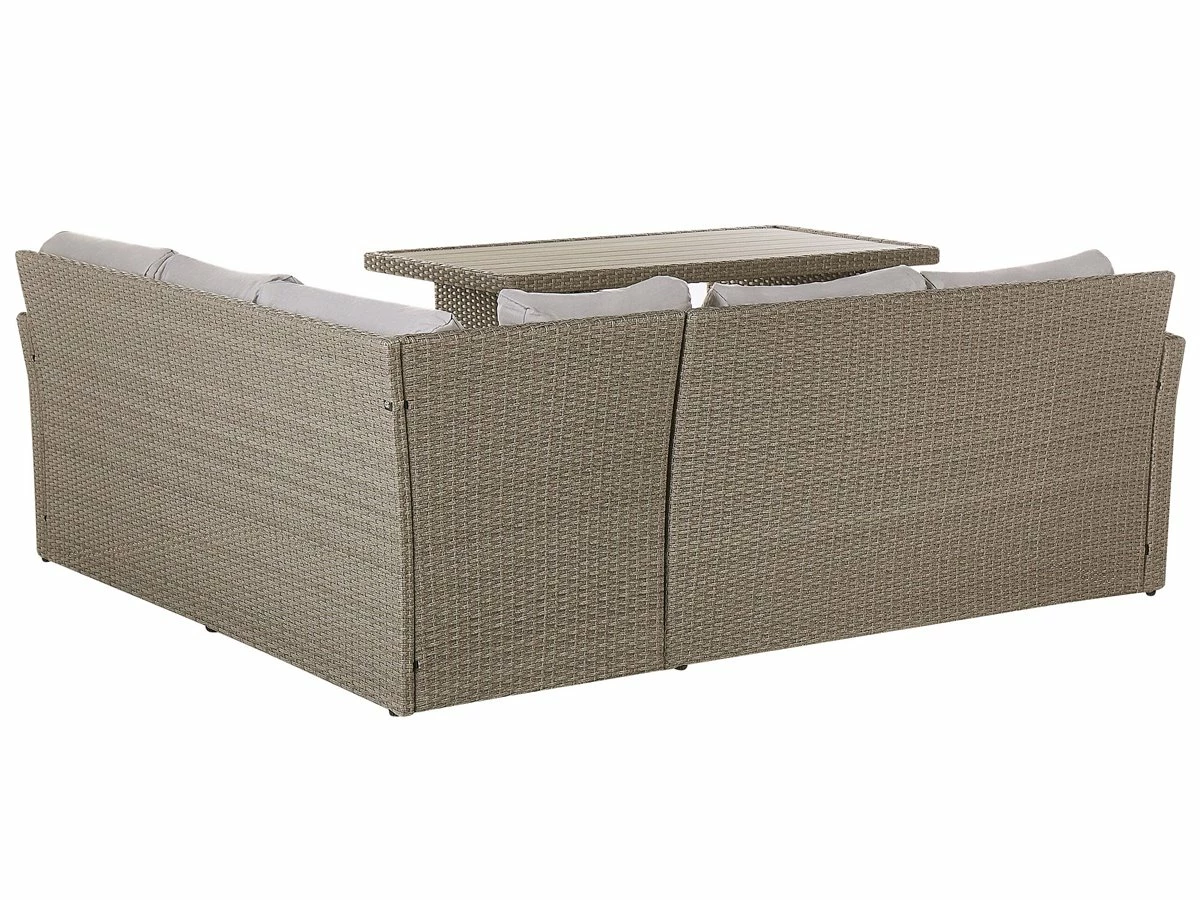 Set de jardín de ratán sintético. Crea el lugar perfecto para una reunión familiar o de amigos con este conjunto de jardín constituido por un sofá esquinero, una mesa de comedor y 2 otomanas. Está fabricado a partir de aluminio de alta calidad cubierto con ratán sintético. Incluye cojines de respaldo y asientos resistentes a los rayos UV con fundas extraíbles y cierres de cremallera. Detalles: Tipo de Producto: Conjunto de comedor Estilo: Tradicional Color: Beige Tonalidad: Gris pardo Tipo de material: Ratán sintético Material principal: Ratán sintético Material adicional: Poliéster Material de la superficie: Material sintético Composición del Material: 100% Poliéster Forma: Forma de L Densidad de espuma del asiento: 25 kg/m3 Dimensiones: Dimensiones de la mesa de centro: 130x70x68 Dimensiones del reposapies: 40x40x43 cm Espesor del asiento: 10 cm Altura del asiento: 45 cm Dimensiones totales: 201x177x74 Peso: 59 kg Capacidad de peso de la mesa: 45 kg Capacidad de peso por persona: 170 kg La oferta incluye: 1 x Sofá esquinero, 1 x Mesa, 2 x Puf, 6 x Cojín del respaldo, 6 x Cojines del asiento, No incluye: decoraciones Ventajas: Ideal para grandes reuniones con amigos y familiares, Diseño atemporal, Resistencia UV 5 (ISO 105-B02, Tejido sólido, Materiales de calidad, Fundas de cojines con costuras ocultas y cremalleras Información de montaje: Requiere montaje completo. Más de 60 min. Información adicional: El producto viene con un libro de cuidados detallado para ayudarte a mantener tus muebles en las mejores condiciones durante muchos años. Consulta estos consejos para garantizar el mantenimiento adecuado de tus muebles nuevos – encontrarás las instrucciones de mantenimiento junto con el manual de montaje. Texto de resistencia: Gracias a su resistencia al agua, puedes utilizar el producto al aire libre y dejarlo a la intemperie durante lluvias ligeras. Si no es posible guardarlo en un lugar cerrado y protegido, recomendamos utilizar una funda protectora. La exposición prolongada a la humedad puede provocar daños en el mueble. Resistencia: Agua ligera / humedad Consejos de mantenimiento: Ratán sintético: 1.Limpiar con detergentes a base de jabón. No utilizar limpiadores químicos corrosivos 2.Los utensilios o accesorios de vidrio pueden sobrecalentar la superficie 3.Para alargar la vida útil del mueble, protéjalo de la exposición directa al sol 4.Se recomienda utilizar una funda protectora para la temporada de invierno o, si es posible, para mantener los muebles secos y frescos en el interior. Poliéster: 1.Lavar a mano únicamente, usar agua fría y un detergente suave 2.Cuando no esté en uso, manténgalo en un lugar limpio y seco para protegerlo de las condiciones atmosféricas 3.No secar en secadora ni planchar. Madera plástica: 1.El material es extremadamente resistente a la intemperie. Sin embargo, se recomienda utilizar una funda protectora para la temporada de invierno o, si es posible, guardar los muebles en un lugar fresco y seco 2.Manténgalo alejado de fuentes de calor, como parrilla o fuego, ya que las chispas pueden causar daños graves. No coloque utensilios calientes directamente sobre la superficie, 3.Limpiar con un limpiador a base de jabón suave y un paño suave