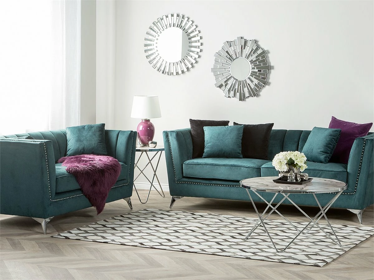 Conjunto de sofás de terciopelo. Añade a tu interior este conjunto de sala de estar de diseño elegante. Está fabricado a partir de terciopelo suave al tacto. El acolchado en el respaldo ofrece la máxima comodidad y aporta un toque de distinción. Las patas de metal garantizan estabilidad. Detalles: Tipo de Producto: Conjunto de sofás Estilo: Glamour Color: Azul Tonalidad: Verde azulado Tipo de material: Poliéster aterciopelado Material principal: Terciopelo Material adicional: Metal Material del relleno: Espuma Composición del Material: 100% Poliéster Estilo del apoyabrazo: Estrecho Parte posterior tapizada: Sí Construcción del asiento: Muelles ondulados Densidad de espuma del asiento: 50 kg/m3 Asientos para: 4 – 6 personas Dimensiones: Dimensiones del sofá de 2 plazas: 160x80x77 Dimensiones del sofá de 3 plazas: 211x80x77 Espesor del asiento: 17 cm Altura del asiento: 48 cm Peso: 93 kg Capacidad de peso por persona: 80 kg La oferta incluye: 1 x Sofá de 3 plazas, 1 x Sofá de 2 plazas, 4 x Cojín Ventajas: Confort del asiento óptimo, Acabado con remaches que enfatizan la forma del mueble, Diseño elegante, Materiales de la más alta calidad, Completamente tapizado Información de montaje: Requiere montaje parcial. 20-40 min. Información adicional: Ten en cuenta que la tela de terciopelo puede presentar un aspecto distinto según la iluminación a la que esté expuesta: tiende a brillar más a la luz del día y a parecer más tenue con luz artificial en interiores. Debido a la estructura suave de alta densidad, la tonalidad puede verse modificada haciendo pasar la mano en distintas direcciones y ángulos. Para igualar el color y eliminar las arrugas, el material debe limpiarse con la palma de mano abierta en una dirección, con un paño húmedo o una plancha con vapor. Consejos de mantenimiento: Poliéster: 1.Aspire con un accesorio adecuado 2.Limpiar con champú seco y una esponja húmeda o un limpiador suave. Metal: 1.Limpie con un limpiador y un paño suave, seque después 2.Para elementos de cobre o cromados, use agente abrillantador 3.Para evitar arañazos, no use limpiadores abrasivos.