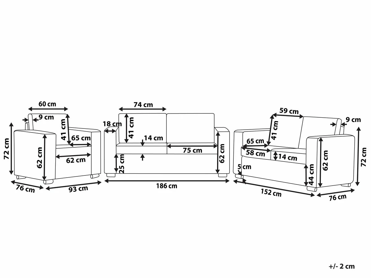 Conjunto de sofás. Añade a tu interior este conjunto de sala de estar de diseño moderno. Está fabricado a partir de piel en todas las superficies de asiento, incluido el respaldo y los reposabrazos. La piel sintética está presente en los laterales y en la parte posterior. El acolchado del asiento ofrece la máxima comodidad. La estructura de madera resistente y las patas de metal garantizan estabilidad. Los cojines adicionales vienen con fundas extraíbles. Detalles: Tipo de Producto: Conjunto de sofás Estilo: Industrial Color: Negro Tipo de material: Piel genuina Material principal: Piel Material adicional: Piel sintética Material del relleno: Espuma Composición del Material: 100% Tela de PVC Estilo del apoyabrazo: Estrecho Parte posterior tapizada: Sí Construcción del asiento: Muelles ondulados Densidad de espuma del asiento: 25 kg/m3 Asientos para: 4 – 6 personas Dimensiones: Dimensiones del sofá de 2 plazas: 152x76x72 Dimensiones del sofá de 3 plazas: 186x76x72 Dimensiones del sillón: 96x76x72 Espesor del asiento: 12 cm Altura del asiento: 41 cm Peso: 113 kg Capacidad de peso por persona: 150 kg La oferta incluye: 1 x Sofá de 2 plazas, 1 x Sofá de 3 plazas, 1 x Sillón Ventajas: Acolchado grueso, Diseño moderno, Materiales de calidad, Fabricación sólida y precisa, Muchas posibilidades de posición, Fundas extraíbles Información de montaje: Requiere montaje parcial. 45-60 min. Información adicional: Todas las superficies de contacto (asientos y cojines están hechas de 100% cuero vacuno, las otras partes están hechas de cuero artificial de alta calidad. Consejos de mantenimiento: Piel: 1.Trate la superficie con un protector de cuero antes de la temporada de invierno. No use quitamanchas, trementina, betún o cualquier tipo de grasa. Los limpiadores abrasivos pueden dejar manchas u oscurecer el cuero 2.Una vez a la semana, limpie con un paño de algodón; una vez al mes limpie con agua y luego seque 3.No use limpiadores abrasivos ya que pueden dañar el material. Evite la fricción fuerte ya que podría dejar rasguños en la superficie 4.El calor y la luz solar hacen que el cuero se seque y pierda color. Manténgalo alejado de la luz solar directa o del radiador 5.Las manchas pequeñas se pueden eliminar con un borrador no teñido. Use un limpiador suave en manchas difíciles. Para las manchas de grasa use vinagre. Piel sintética: 1.Limpie con agua destilada y use limpiadores a base de jabón en las manchas difíciles 2.Aspire con un accesorio adecuado 3.Una vez a la semana, limpie con un paño húmedo y seque después. No engrasar, 4.Use solo limpiadores suaves y acondicionadores dedicados a la piel sintética