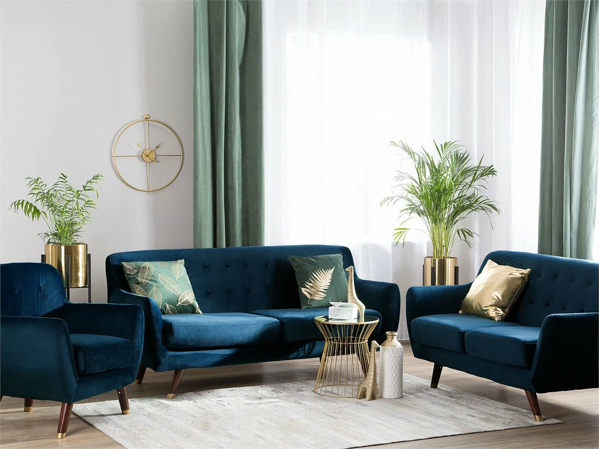 Conjunto de sofás de terciopelo. Añade a tu interior este conjunto de sala de estar de 6 plazas de diseño moderno y funcional. Está constituido por un sofá de 3 plazas, uno de 2 y un sillón. El respaldo abotonado, los reposabrazos inclinados y las patas de madera de caucho aportan un toque retro. Está fabricado a partir de tela de terciopelo de alta calidad. Los cojines vienen con fundas extraíbles. Detalles: Tipo de Producto: Conjunto de sofás Estilo: Glamour Color: Verde Tonalidad: Verde esmeralda Tipo de material: Poliéster aterciopelado Material principal: Terciopelo Material adicional: Madera de caucho Material del relleno: Espuma Composición del Material: 100% Poliéster Estilo del apoyabrazo: Integrado Parte posterior tapizada: Sí Construcción del asiento: Muelles ondulados Densidad de espuma del asiento: 50 kg/m3 Asientos para: 4 – 6 personas Dimensiones: Dimensiones del sofá de 2 plazas: 85x148x84 Dimensiones del sofá de 3 plazas: 84x188x85 Dimensiones del sillón: 84x80x81 Espesor del asiento: 14 cm Altura del asiento: 45 cm Peso: 94 kg Capacidad de peso por persona: 150 kg La oferta incluye: 1 x Sofá de 3 plazas, 1 x Sofá de 2 plazas, 1 x Sillón Ventajas: El grueso acolchado del asiento brinda comodidad, Estilo retro, Tejido aterciopelado suave como la seda, Fundas extraíbles, Patas con tapas anti-deslizantes, Completamente tapizado Información de montaje: Requiere montaje parcial. 45-60 min. Información adicional: A efectos de transporte, las patas están ocultas en un bolsillo en la parte inferior del asiento. Ten en cuenta que la tela de terciopelo puede presentar un aspecto distinto según la iluminación a la que esté expuesta: tiende a brillar más a la luz del día y a parecer más tenue con luz artificial en interiores. Debido a la estructura suave de alta densidad, la tonalidad puede verse modificada haciendo pasar la mano en distintas direcciones y ángulos. Para igualar el color y eliminar las arrugas, el material debe limpiarse con la palma de mano abierta en una dirección, con un paño húmedo o una plancha con vapor. Consejos de mantenimiento: Terciopelo: 1.Limpiar con champú seco y una esponja húmeda o un limpiador suave 2.Aspire con un accesorio adecuado. Madera de caucho: 1.Limpie con un limpiador y un paño suave en la dirección del grano 2.Los muebles con acabado de aceite deben engrasarse una vez al año, 3.Seque inmediatamente después de limpiar. para evitar que se acumule agua en los muebles.