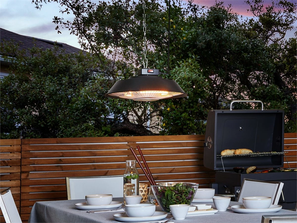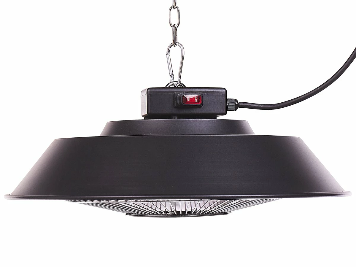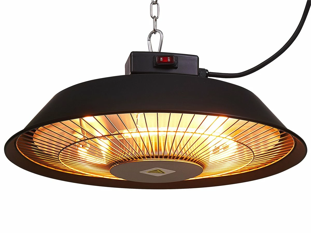 Calentador de exterior. Esta estufa eléctrica de exterior con forma de lámpara es, a su vez, decorativa y funcional. La luz generada se asemeja a la de los rayos de sol. El interruptor ubicado en la parte superior del calefactor permite apagar el dispositivo. Detalles: Tipo de Producto: Estufa de patio Color: Negro Tipo de material: Metal Material principal: Aluminio Código de protección IP: IP 44 (Impermeable Consumo de potencia: 1500 W Montaje: Colgante Dimensiones: Longitud del cable: 185 cm Profundidad: 44 cm Ancho: 44 cm Altura: 61 cm Peso: 3 kg La oferta incluye: 1 x Estufa de exterior Ventajas: Perfecto para todo tipo de exterior, Cumple con los estándares PAH, RoHS y SAA, Certificados GS, CE, CB, Ideal para uso al aire libre Información de montaje: Requiere montaje parcial. 20-40 min. Información adicional: La estufa requiere hasta 5 minutos para alcanzar su máxima potencia de calentamiento, Distancia mínima: 25 cm de la pared, 50 cm del techo, 180 cm del suelo, La distancia óptima de calentamiento es de 2 metros. Aunque se puede sentir el calor a mayor distancia, se recomienda colocar el dispositivo lo más cerca posible y así aprovechar al máximo su potencial. Consejos de mantenimiento: Aluminio: 1.Antes de comenzar a limpiar, desconecta el enchufe. No toques la estufa cuando esté caliente o no se haya enfriado por completo 2.Limpiar con un paño húmedo, 3.No meter en el agua.