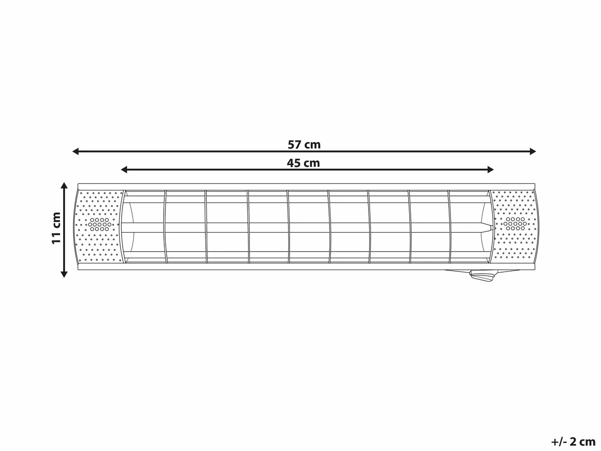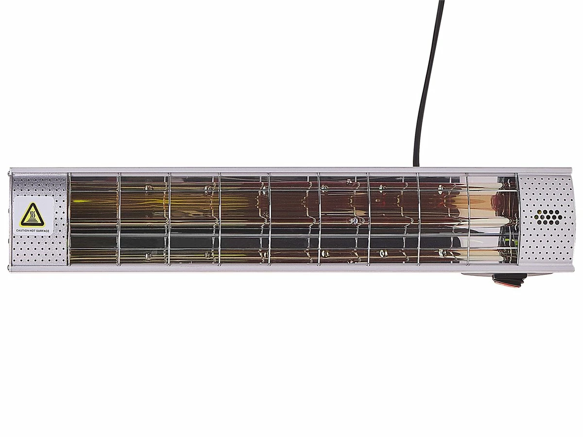 Calentador de exterior. Esta estufa eléctrica de exterior es ideal para las tardes frías de reunión en el patio. Al calentar mediante radiación infrarroja, el calentador no emite dióxido de carbono. Se puede colocar fácilmente en la pared. Detalles: Tipo de Producto: Estufa de patio Color: Plateado Tipo de material: Metal Material principal: Aluminio Código de protección IP: IP 55 (anti polvo y humedad Consumo de potencia: 2000 W Montaje: De pared Dimensiones: Longitud del cable: 185 cm Profundidad: 10 cm Ancho: 57 cm Altura: 11 cm Peso: 3 kg La oferta incluye: 1 x Estufa de exterior, Kit de montaje Ventajas: Brinda un toque acogedor a cualquier espacio, Alta calidad, Cumple con los estándares PAH, RoHS y SAA, Certificados GS, CE, CB, Ideal para uso al aire libre Información de montaje: Requiere montaje parcial. 20-40 min. Información adicional: La estufa requiere hasta 5 minutos para alcanzar su máxima potencia de calentamiento, La distancia óptima de calentamiento es de 2 metros. Aunque se puede sentir el calor a mayor distancia, se recomienda colocar el dispositivo lo más cerca posible y así aprovechar al máximo su potencial. Consejos de mantenimiento: Aluminio: 1.No meter en el agua 2.Antes de comenzar a limpiar, desconecta el enchufe. No toques la estufa cuando esté caliente o no se haya enfriado por completo 3.Limpiar con un paño húmedo