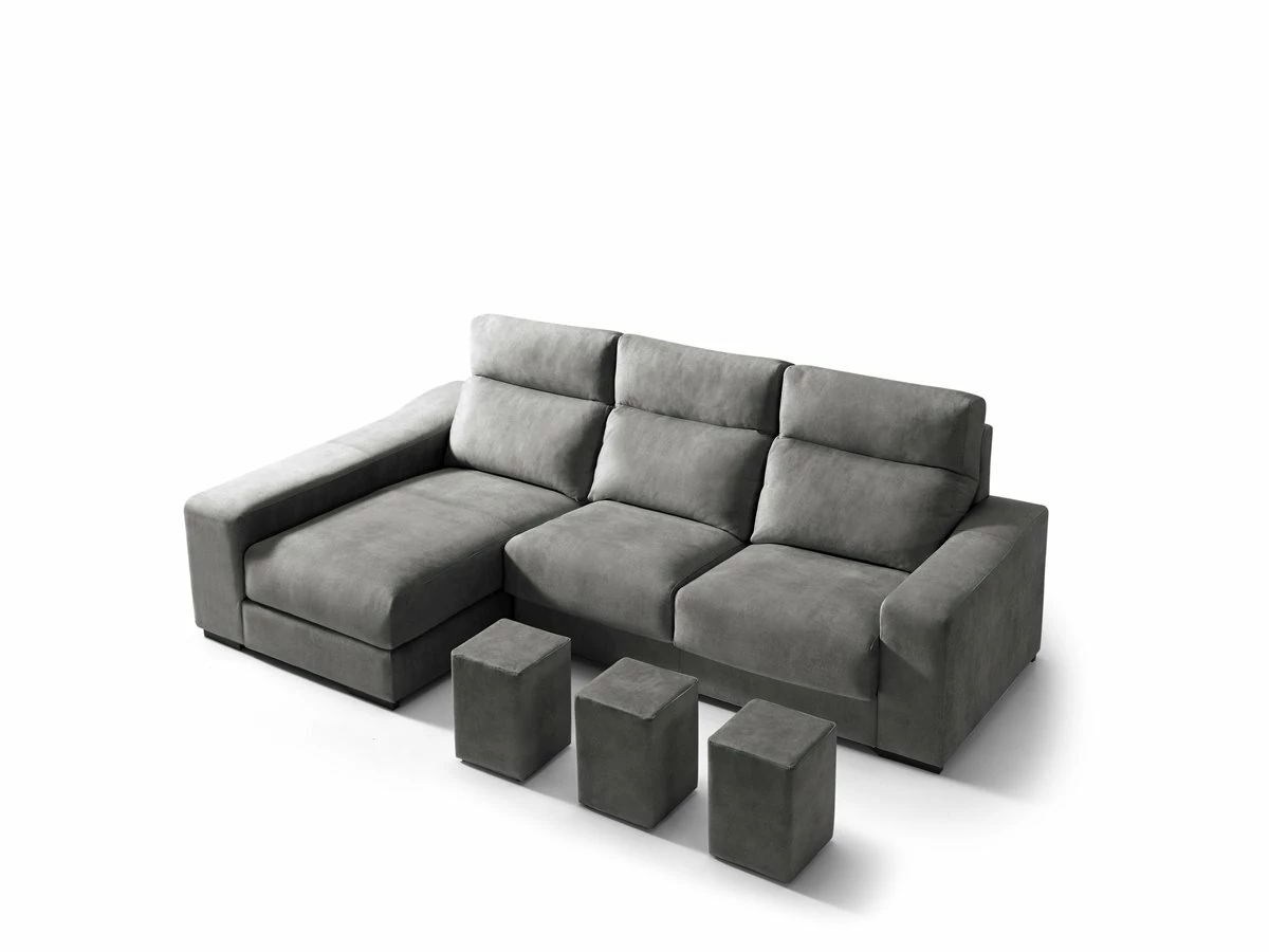 Necesitas un chaise longue y no sabes cual elegir? Te presentamos el chaise longue 3 plazas con 3 poufs FULL. Su estructura esta construida en madera maciza y tablero de partículas con el que te sentirás cómodo en cualquier momento. Tambien puedes elegir como quieres la chaise longue si en la derecha o en la izquierda.