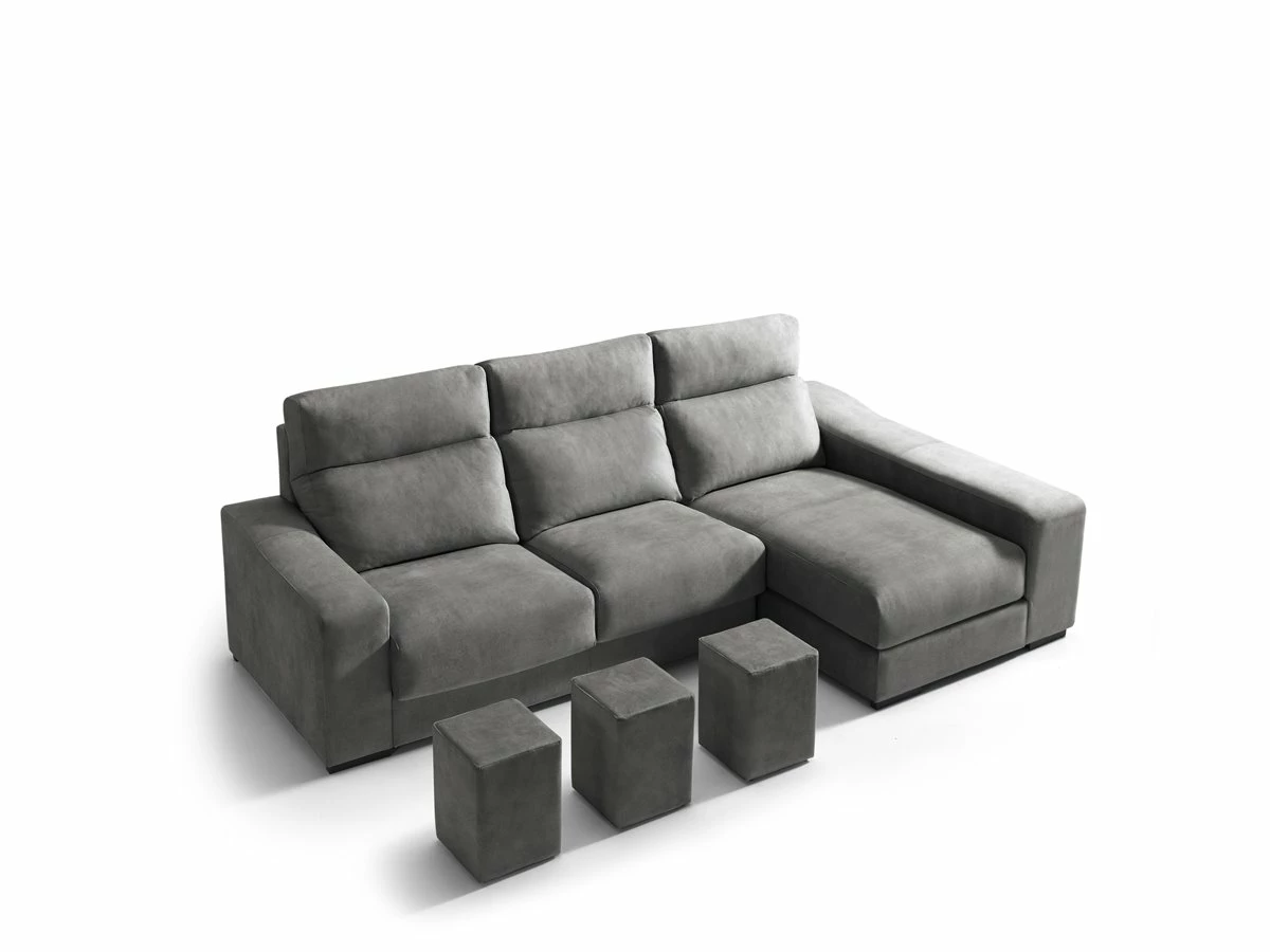 Necesitas un chaise longue y no sabes cual elegir? Te presentamos el chaise longue 3 plazas con 3 poufs FULL. Su estructura esta construida en madera maciza y tablero de partículas con el que te sentirás cómodo en cualquier momento. Tambien puedes elegir como quieres la chaise longue si en la derecha o en la izquierda.