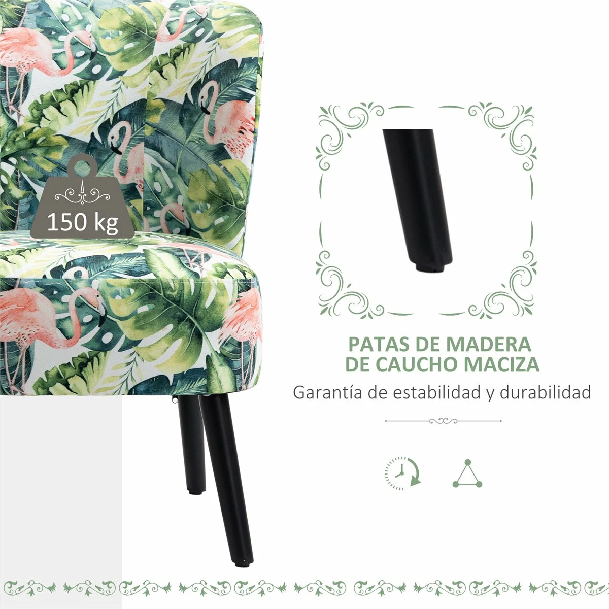 - – SILLÓN SIN BRAZOS: Sofá de 1 sola plaza sin reposabrazos, adecuado para espacios con muebles y decoraciones modernas o tradicionales. Al carecer de soportes laterales ofrece mayor libertad de movimiento al usuario – BONITO ESTAMPADO: Diseñado con un bonito estampado de flamencos y hojas, este sillón será un complemento que aportará frescura allá donde lo coloques. Apta para la sala de estar, comedor, recepción, dormitorio, estudio y más – CÓMODO Y RESISTENTE: Sofá con estructura y patas de madera maciza de caucho. Acolchado de alta densidad y tapizado en agradable tela de franela impresa (100% poliéster – PIES ANTIDESLIZANTES: Las patas decorativas de madera de caucho cuentas con almohadillas protectoras antideslizantes, para ofrecer mayor estabilidad al sofá y evitar daños y rayones en el suelo – MEDIDAS TOTALES: 58x69x78 cm (LxANxAL. Medidas del asiento: 54x47x42 cm (LxANxAL. Peso máximo soportado: 150 kg. Certificaciones: EN 12520