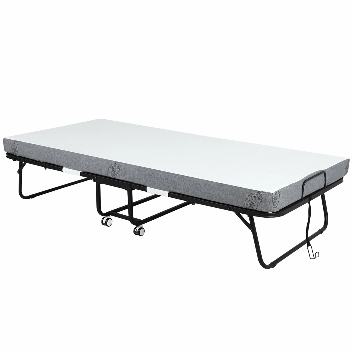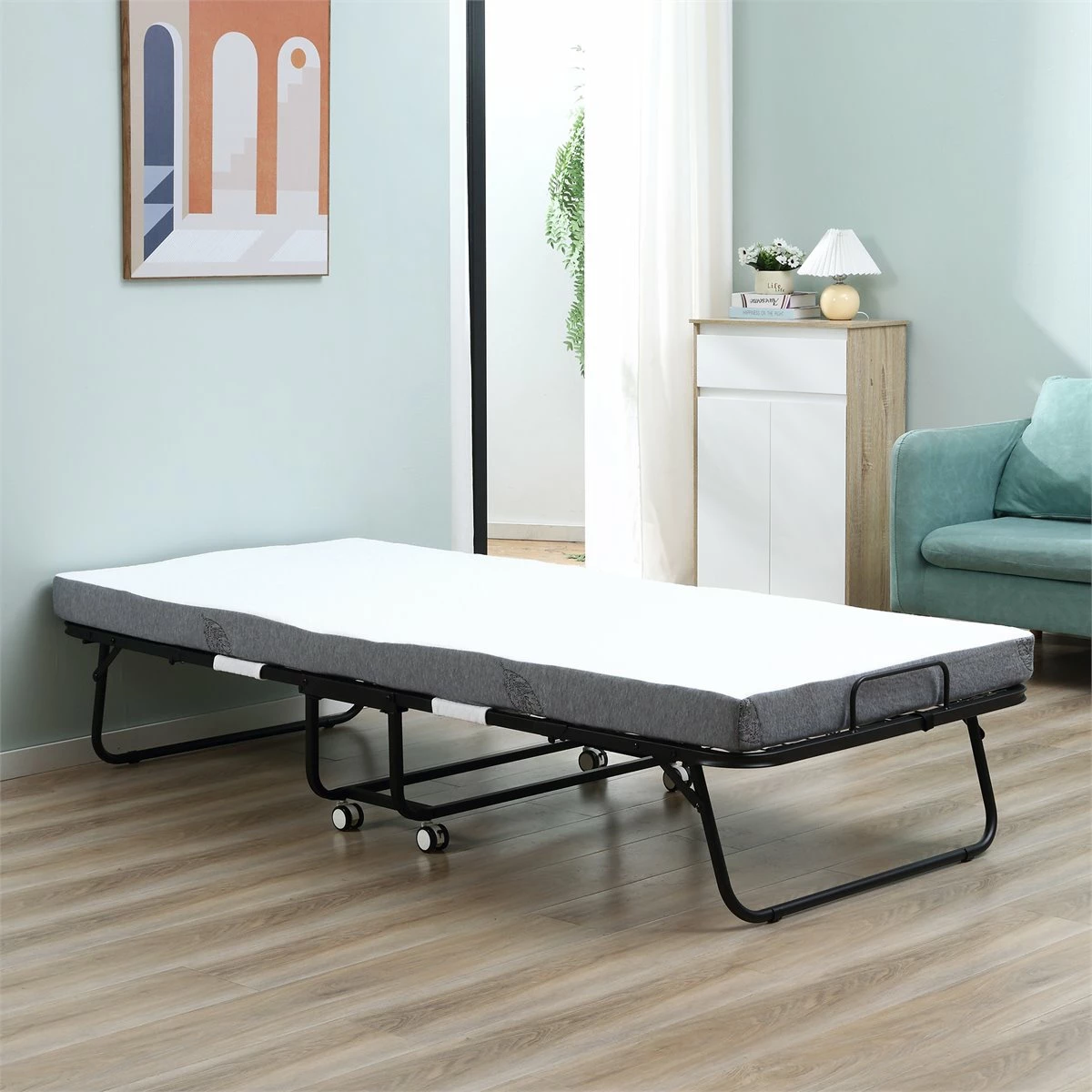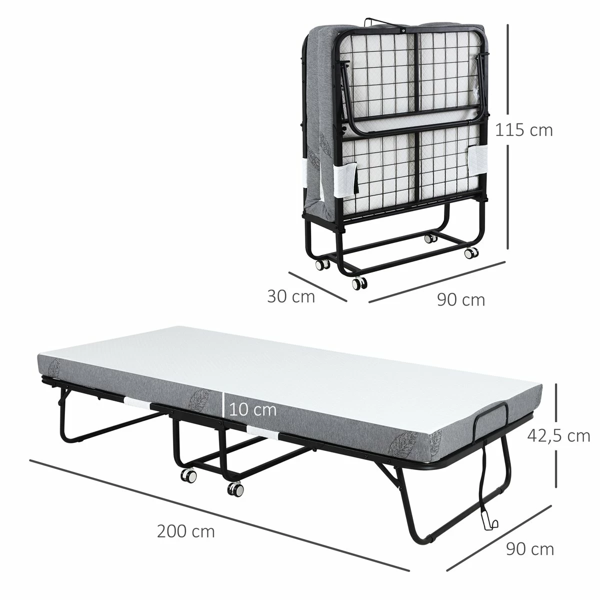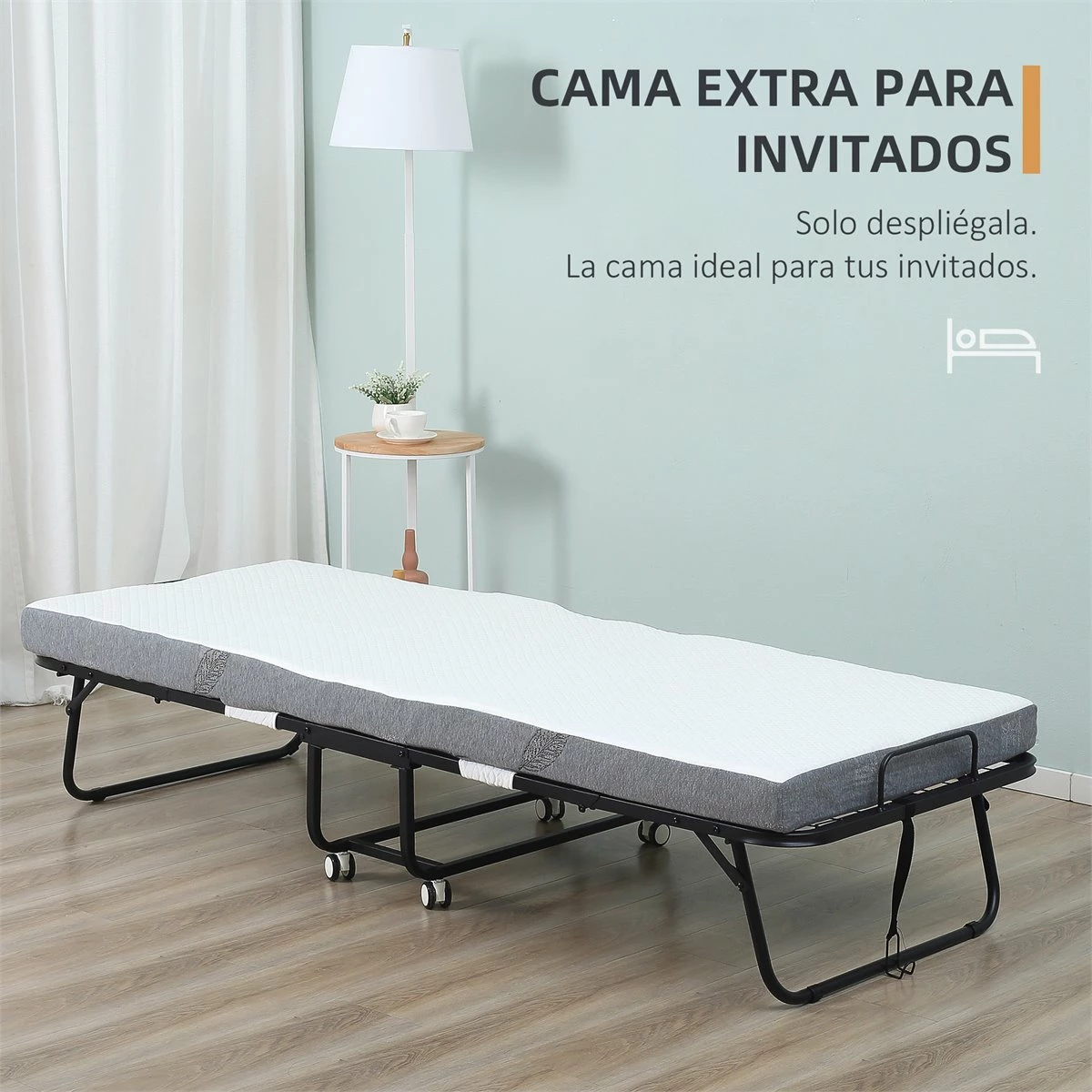 ¿Te preocupa que no haya camas disponibles para tus huéspedes? Esta cama supletoria de HOMCOM es la solución ideal. Con esta cama, puedes crear rápida y fácilmente un espacio cómodo para tus invitados durante la noche. No se necesita espacio adicional. Cuando no esté en uso, puede plegarla y colocarla en cualquier rincón o esquina para ahorrar espacio. Además, con la ayuda de sus 4 ruedas, 2 de ellas con freno, podrás mover fácilmente tu cama donde quieras. Características: Cama individual, cómoda y compacta para invitados Perfecta para tener una cama adicional y cómoda para tus invitados, sin necesitar apenas espacio adicional Diseño plegable para ahorrar espacio y facilitar su almacenamiento El colchón de 10 cm de grosor ofrece una cómoda experiencia de sueño Estructura metálica que garantiza durabilidad y estabilidad 4 ruedas universales para mover la cama con facilidad, 2 de ellas con freno Requiere montaje Especificaciones: Color: colchón blanco y estructura negra Material: acero, espuma y poliéster Medidas totales: 200x90x42,5 cm (LxANxAL Medido plegado: 90x30x115 cm (LxANxAL Grosor del colchón: 10 cm Carga máxima: 150 kg Referencia: 831-516V01