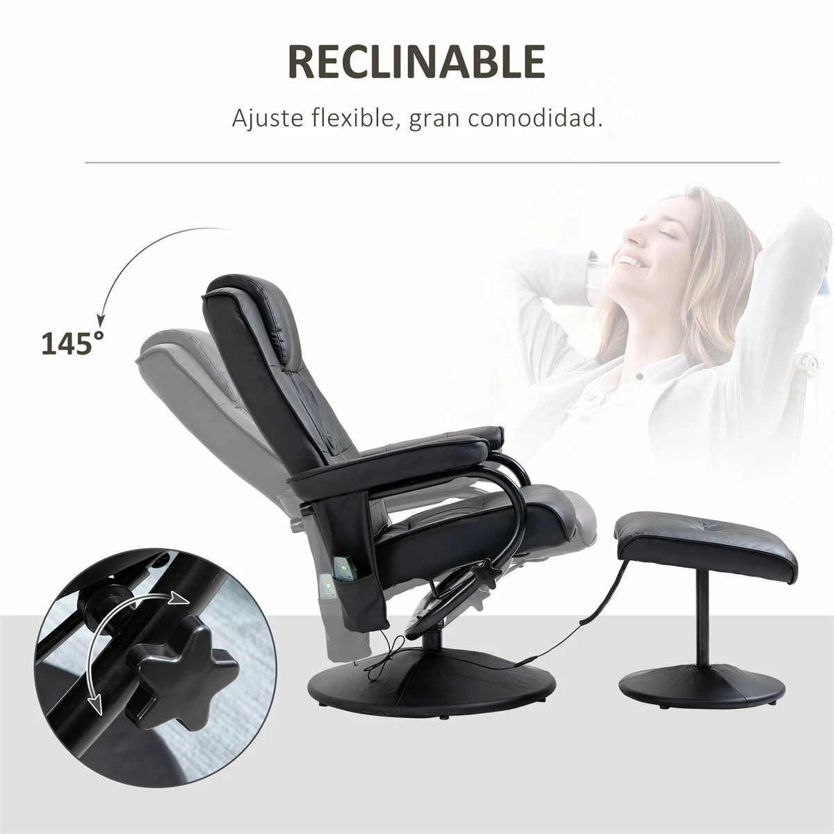 - – MÁXIMO CONFORT: Con asiento, respaldo y apoyabrazos acolchados en espuma gruesa, este sillón es ideal para ofrecerte una buena relajación. Cuenta con un reposapiés a conjunto. Tapizado en piel PU, le da un toque elegante y facilita su limpieza. Perfecto para relajarte en la sala de estar o el dormitorio mientras tomas una siesta o miras la televisión – MASAJE DE 10 PUNTOS: Este sillón de masaje relajante tiene 10 puntos de vibración para que puedas relajarte por completo. Tiene 6 en el respaldo, 2 en el asiento y 2 en el reposapiés – MANDO A DISTANCIA Y BOLSILLO LATERAL: Controla cómodamente el modo y la intensidad de tus masajes gracias al mando incluido. El sillón tiene un bolsillo en uno de los laterales para que puedas guardarlo junto a otros artículos pequeños que quieras tener a mano – RECLINABLE Y GIRATORIO: Este sillón de masaje puede reclinarse hasta 145° simplemente haciendo una ligera presión hacia atrás o inclinándote hacia adelante. Además, este sillón se puede girar 360°, lo que le permite estirarse y relajarse por completo para una comodidad óptima – MEDIDAS TOTALES: 77x84x95 cm (LxANxAL. Medidas del asiento: 50×52 cm (LxAN. Medidas del reposapiés: 43x43x41 cm (LxANxAL. Peso máximo soportado: 120 kg. Requiere montaje