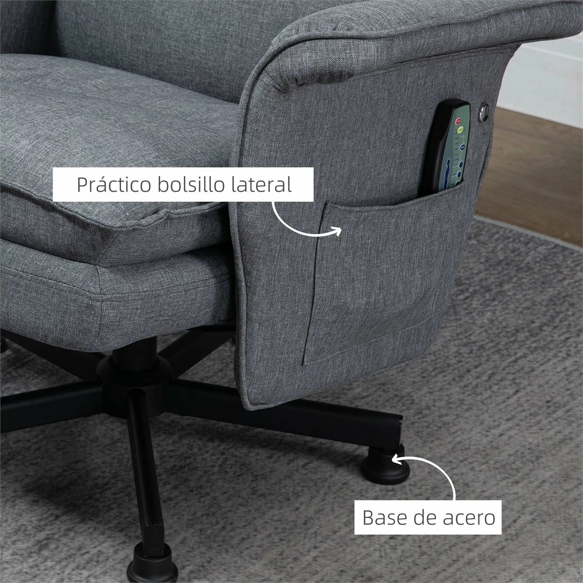 Relájate y olvídate del estrés de tu largo día gracias a este fantástico sillón de relajación con función de masaje de HOMCOM. Con 8 puntos de masaje diferentes, repartidos por la espalda, lumbares, muslos y piernas. Se puede programar fácilmente con el control remoto incluido. No pierdas la oportunidad de descansar como te mereces gracias a este relajante sillón. Características – Sillón de relax con reposapiés acolchado grueso para elevar los pies incluido – Sillón de relajación con 8 puntos de masaje distribuidos entre la espalda, lumbar, cojín del asiento y el reposapiés – Dos niveles de intensidad, cinco modos funcionales y 3 configuraciones de temporizador para varios tipos de masajes – Acolchado grueso y asiento giratorio para una comodidad y relajación óptimas – La superficie del tejido con tacto de lino es agradable para la piel y transpirable – Mando a distancia incluido con un práctico bolsillo lateral para guardarlo – Se requiere montaje Especificaciones – Colores: gris – Materiales: lino sintético (100% poliéster, espuma, tablero multicapa, acero – Medidas del sillón: 78x81x99 cm (LxANxAL – Medidas del reposapiés: 47x46x49 cm (LxANxAL – Medidas del asiento: 52x50x44 cm (LxANxAL – Grosor del asiento: 10 cm – Medidas del respaldo: 67x49x12 cm (LxANxAL – Carga máxima: 120 kg – Referencia: 700-165V90GY