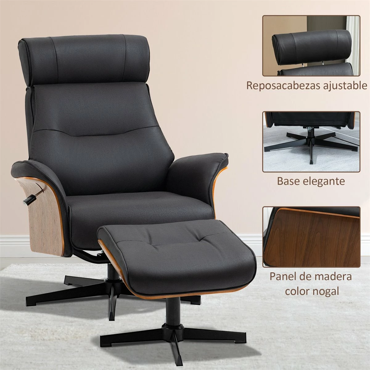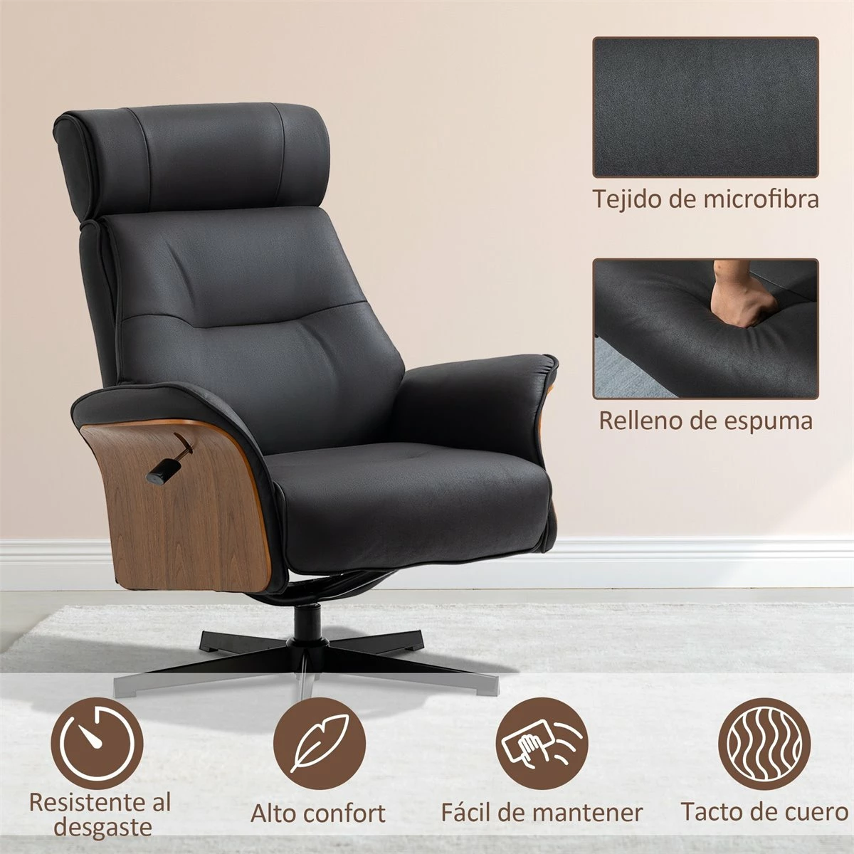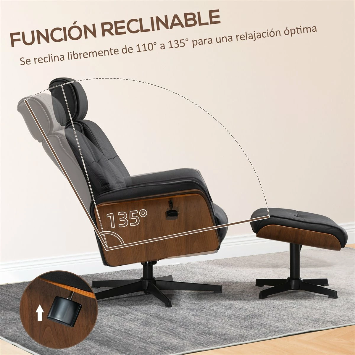 - – SILLÓN DE RELAX RECLINABLE: Este sillón está compuesto por 2 piezas, una butaca y un reposapiés, perfecto para relajarse en la sala de estar o en el dormitorio mientras tomas una siesta o miras la televisión – RECLINACIÓN DE 135°: Este sillón relax con otomana puede reclinarse hasta 135° fácilmente mediante la palanca con resorte de gas, permitiendo pasar fácilmente de la posición de sentado vertical a una posición reclinada de mayor relajación – MÁXIMO CONFORT: Con asiento, respaldo alto con reposacabezas ajustable (arriba/abajo y apoyabrazos acolchados en espuma gruesa, esta butaca de relax ergonómica es ideal para ofrecerte una buena relajación. Tiene un reposapiés para apoyar tus pies, que también se puede usar de forma individual como taburete o asiento extra – GIRATORIO Y RESISTENTE: Este asiento puede girar 360°, lo que permite un movimiento circular completo. Con marco de acero y madera en los laterales de los reposabrazos del sillón y en el asiento del reposapiés, ofrece un producto resistente a la vez que cómodo gracias a su acolchado grueso y el tapizado en piel sintética, de tacto agradable y que le da un toque elegante y facilita su limpieza – MEDIDAS TOTALES: 84x83x103 cm. Medidas totalmente reclinadas: 84x98x95 cm. Medidas del reposapiés: 46x46x38 cm. Peso máximo soportado: 150 kg (sillón, 100 kg (reposapiés. Requiere montaje