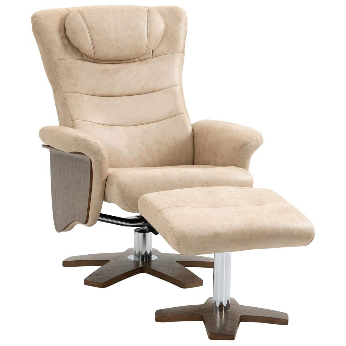 - – SILLÓN DE RELAX RECLINABLE: Este sillón está compuesto por 2 piezas, una butaca y un reposapiés, perfecto para relajarse en la sala de estar o en el dormitorio mientras tomas una siesta o miras la televisión – RECLINACIÓN DE 135°: Este sillón relax con otomana puede reclinarse hasta 135°. La base de madera curvada en color nogal, tanto del sillón como del reposapiés, los mantienen equilibrados y estables, lo que le permite estirarse y relajarse por completo con total seguridad – MÁXIMO CONFORT: Con asiento, respaldo alto y apoyabrazos acolchados en espuma gruesa, esta butaca reclinable con reposapiés es ideal para ofrecerte una buena relajación. Tiene un reposapiés para apoyar tus pies, que también se puede usar de forma individual como taburete o asiento extra – GIRATORIO Y RESISTENTE: Este asiento puede girar 360°, lo que permite un movimiento circular completo. Con marco de acero y base de madera, ofrece un asiento resistente a la vez que cómodo gracias a su acolchado grueso y el tapizado en piel sintética, de tacto agradable y que le da un toque elegante y facilita su limpieza – MEDIDAS TOTALES: 78x83x103 cm. Medidas totalmente reclinadas: 78x110x90 cm. Medidas del reposapiés: 50x43x42 cm. Peso máximo soportado: 150 kg (sillón, 100 kg (reposapiés. Requiere montaje