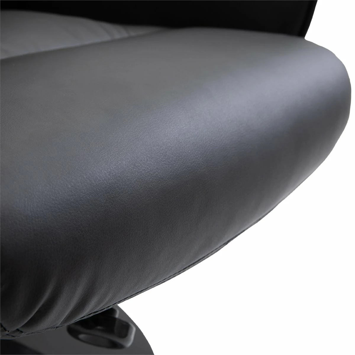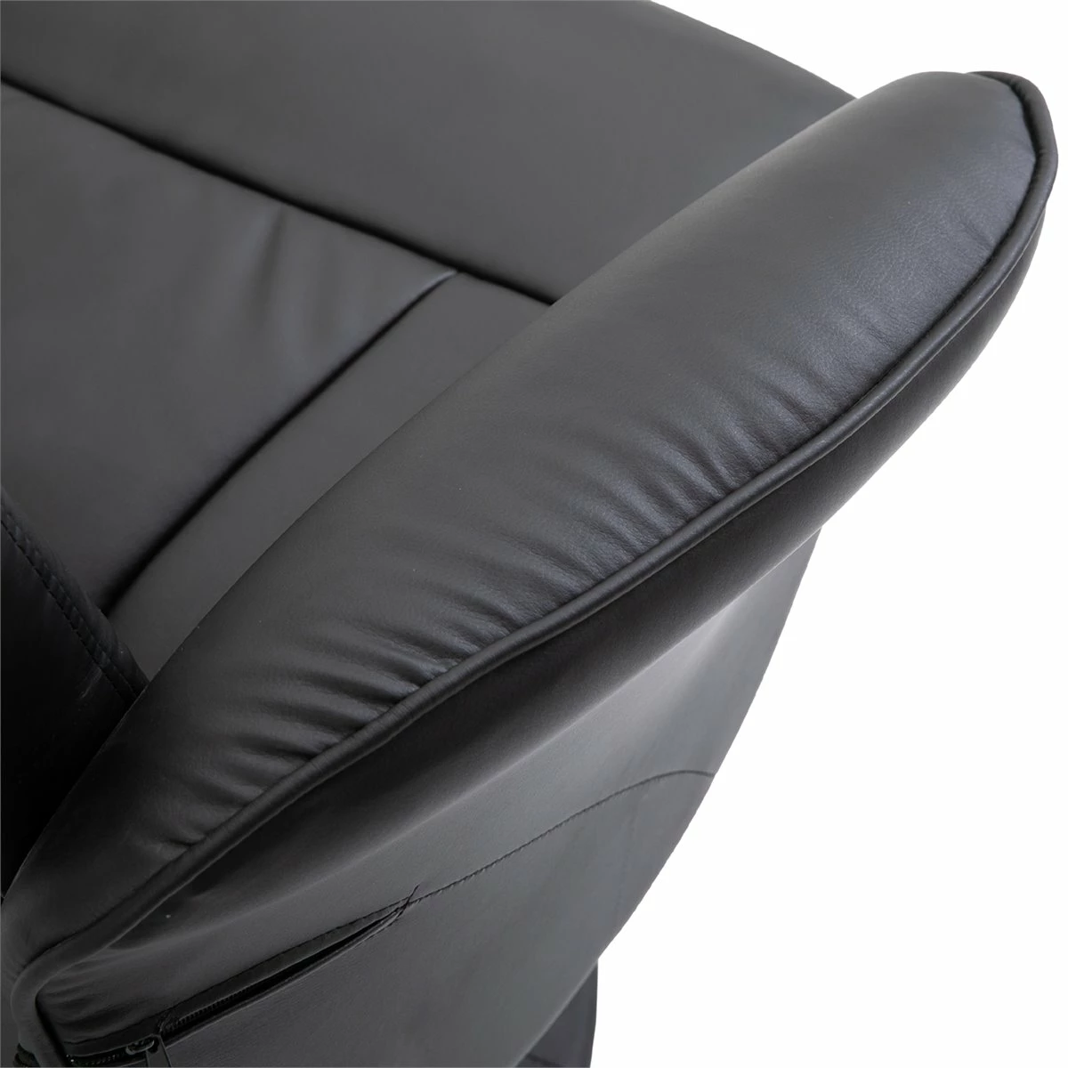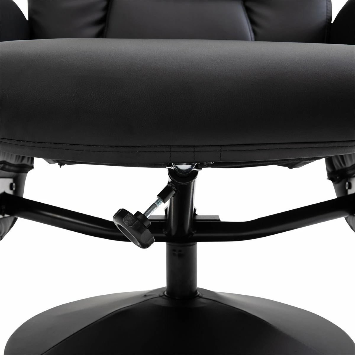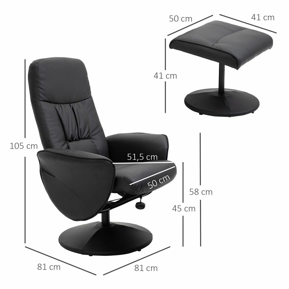 - – SILLÓN RECLINABLE CON REPOSAPIÉS: Este sillón relax con otomana está compuesto por 2 piezas, una butaca con respaldo regulable hasta 145° y un reposapiés, perfecto para relajarse en la sala de estar o en el dormitorio mientras tomas una siesta o miras la televisión – MÁXIMO CONFORT: Con asiento, respaldo alto y apoyabrazos acolchados en espuma gruesa, este sillón para salón es ideal para ofrecerte una buena relajación. Tiene un reposapiés para elevar cómodamente las piernas – ESTRUCTURA RESISTENTE: El marco de acero y la base redonda proporcionan un sillón resistente y duradero, lo que le permite estirarse y relajarse por completo con total seguridad – GIRATORIO 360°: Este asiento puede girar 360°, lo que permite un movimiento circular completo. Tapizado en piel sintética, le da un toque elegante y facilita su limpieza – MEDIDAS TOTALES: 81x81x105 cm (LxANxAL. Medidas totalmente reclinadas: 81x103x91 cm (LxANxAL. Medidas del reposapiés: 50x41x41 cm (LxANxAL. Peso máximo soportado: 160 kg (sillón, 20 kg (reposapiés. Requiere montaje