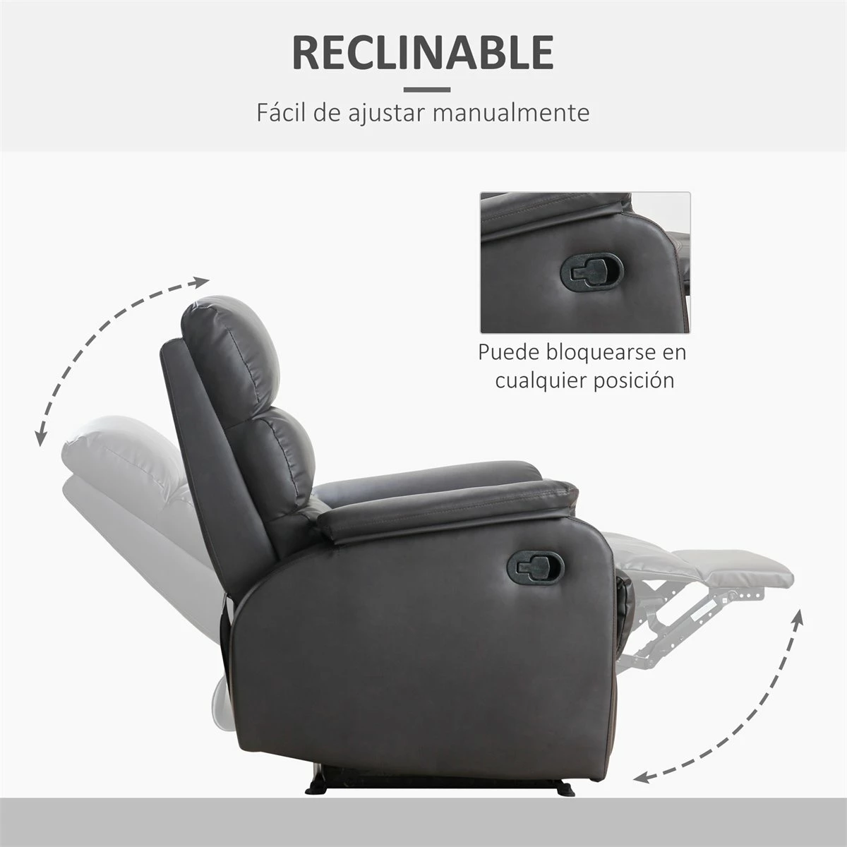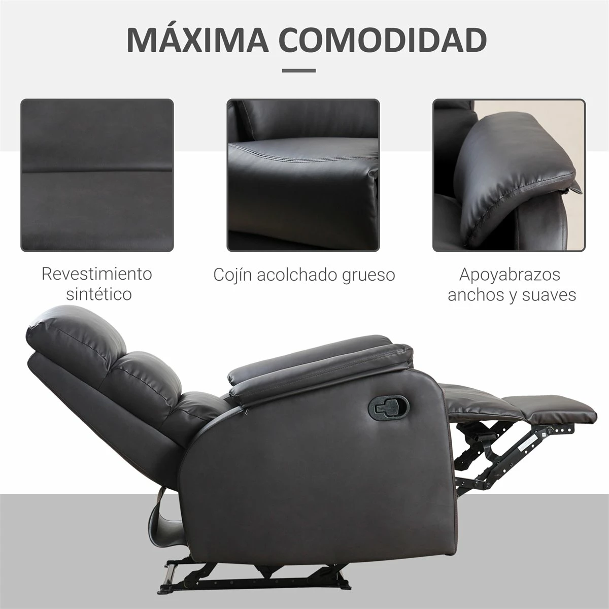 Relájate y olvida el estrés de tu larga jornada gracias a este fantástico sillón reclinable de HOMCOM. Con acolchado grueso y tapizado en agradable tejido de cuero sintético, es un sillón de aspecto elegante y muy cómodo. Además, cuenta con un reposapiés abatible para que tu experiencia de descanso aún sea más confortable e incluso puedas echarte una siesta en él.