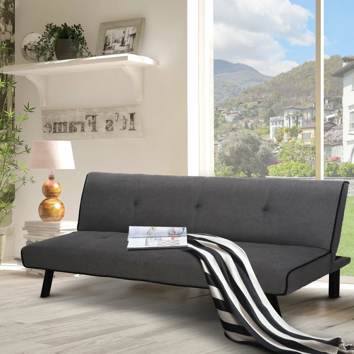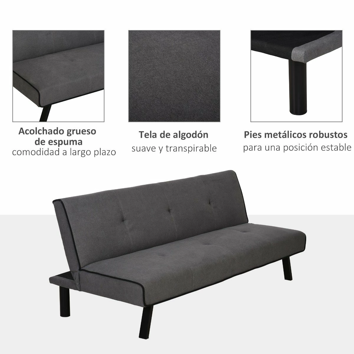 - – DISEÑO 2 EN 1: es un sofá de tres plazas perfecto tanto para salones, como para zonas de descanso de oficinas. Además, tiene un plus y es que se convierte en cama. Por lo que podrás tener una cama extra sin ocupar espacio de más. – RESPALDO AJUSTABLE: puedes inclinarlo en 3 diferentes grados según tus preferencias (105°, 155° y 180°. – ACOLCHADO CÓMODO: su cubierta de algodón y poliéster tienen un tacto aterciopelado que te encantará. Además, su mullido acolchado te ofrece un agradable lugar de descanso. – ESTRUCTURA SÓLIDA: está formado por patas metálicas, decorativas y funcionales, y estructura de eucalipto y MDF de grado E1. – MEDIDAS: El sofá mide 170x76x72,5 cm (LxANxAL. La cama tiene un tamaño de 170x92x34 cm (LxANxAL. El sofá puede soportar hasta un máximo de 300 kg de peso.