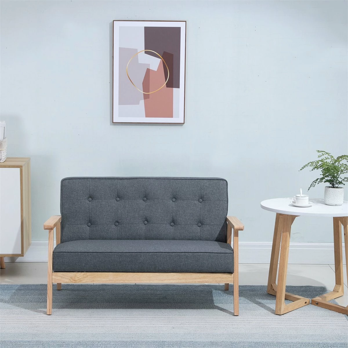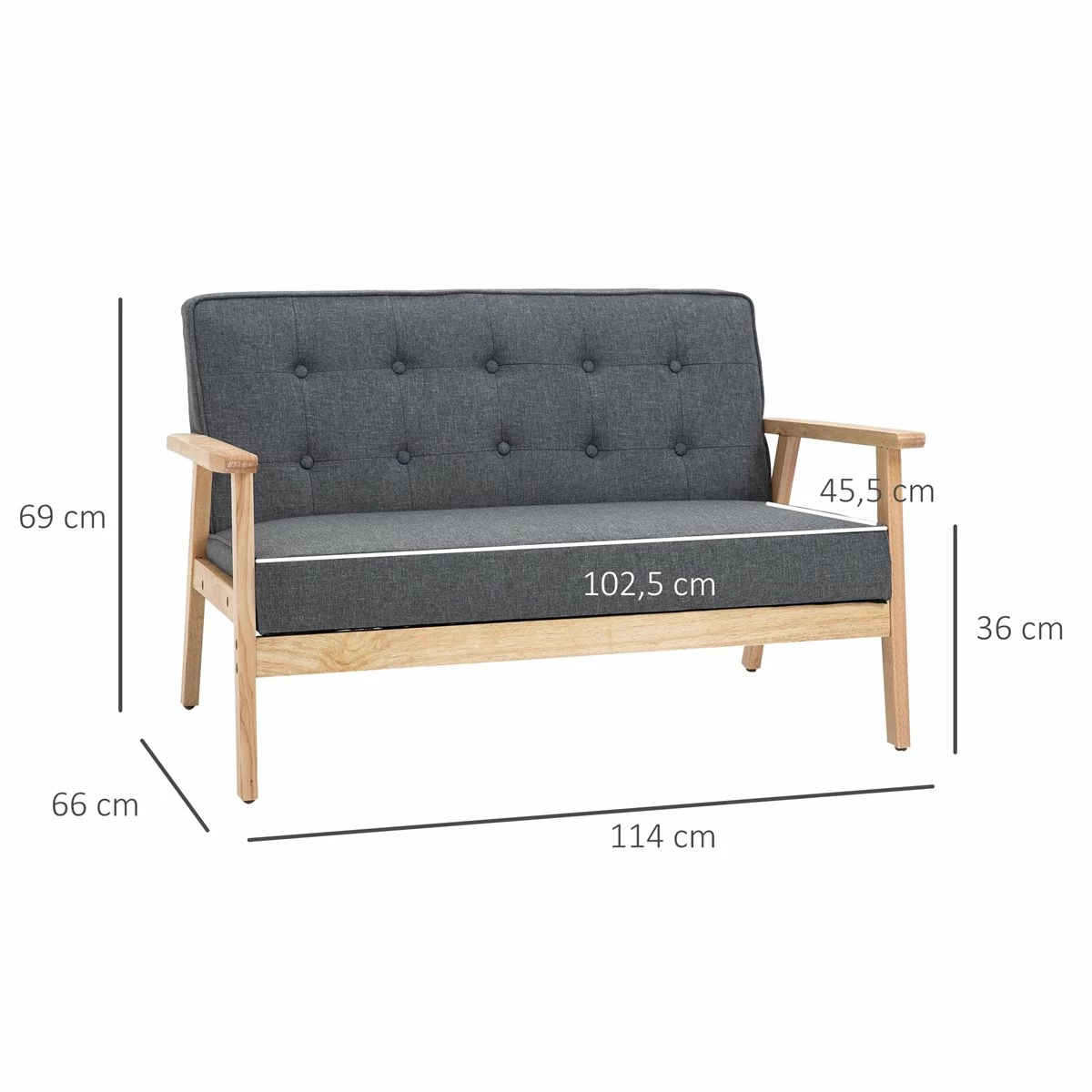- – SOFÁ DE DOS PLAZAS: Sofá de tamaño compacto con espacio suficiente para que puedan sentarse 2 personas. Ideal para la sala de estar, despacho y pisos de dimensiones reducidas – ESTILO RETRO: Añade un toque nórdico y retro a tu espacio con este bonito sofá con elegante diseño de mechones con botones en el cojín del respaldo y estructura de madera – CÓMODO: Los dos grandes cojines del sofá, de asiento y respaldo, ofrecen un confort excepcional. Los mechones con botones del sofá, además de darle un toque elegante, añaden firmeza al relleno – RESISTENTE Y DURADERO: Estructura de madera de caucho resistente, con pies con almohadillas antideslizantes para evitar rayones en el suelo y proporcionar mayor adherencia – MEDIDAS TOTALES: 114x66x69 cm (LxANxAL; Medidas del asiento: 102,5×45,5×36 cm (LxANxAL; Peso máximo soportado: 250 kg