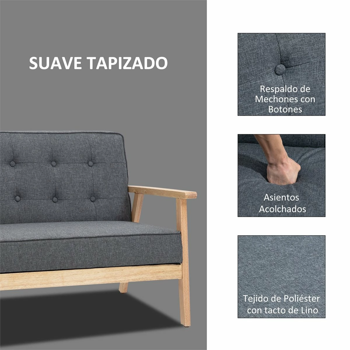 - – Material: lino (poliéster, madera de caucho y espuma