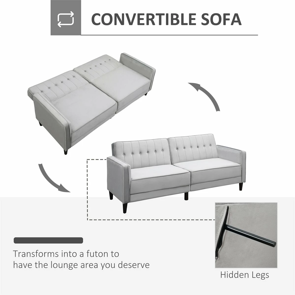 - – SOFÁ CONVERTIBLE EN CAMA: Este sofá se puede transformar rápida y fácilmente en una cama individual de 104 cm de ancho ofreciendo un lugar de descanso para tus invitados o si deseas quedarte una noche a dormir en el salón después de mirar una película – RESPALDOS RECLINABLES: Este sofá moderno cuenta con un respaldo compuesto por 2 partes. Cada una se puede reclinar por separado en 3 posiciones diferentes para que encuentres la postura más cómoda cuando mires la televisión, descanses o tomes una siesta – CÓMODO Y ELEGANTE: El sofá cama cómodo, tapizado en agradable tejido de terciopelo sintético, ofrece una comodidad excepcional, para descansar y relajarte en tu tiempo libre. El resorte curvo con correas elásticas ofrecen un asiento más flexible y cómodo. Con cojín de espuma viscoelástica – MATERIAL RESISTENTE: Las patas de este sofá cama de matrimonio contribuyen a su fortaleza gracias a su dureza y resistencia. Al mantener la base elevada, protege de la humedad y a la vez facilita la limpieza del suelo. El tejido de poliéster con tacto aterciopelado es suave y transpirable – MEDIDAS TOTALES: en posición de sofá 189x81x83,5 cm (LxANxAL y en posición de cama 189x104x62,5 cm (LxANxAL. Peso máximo soportado: 300 kg