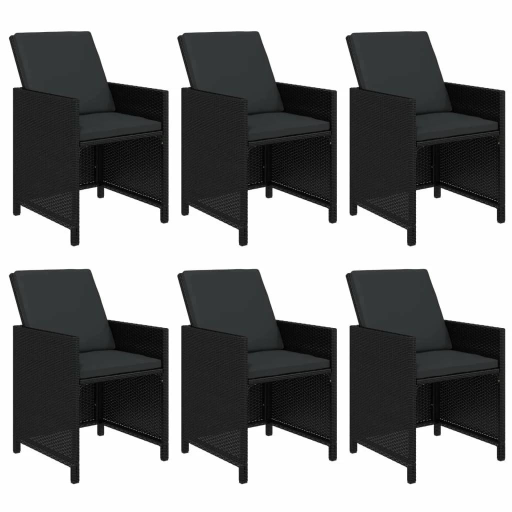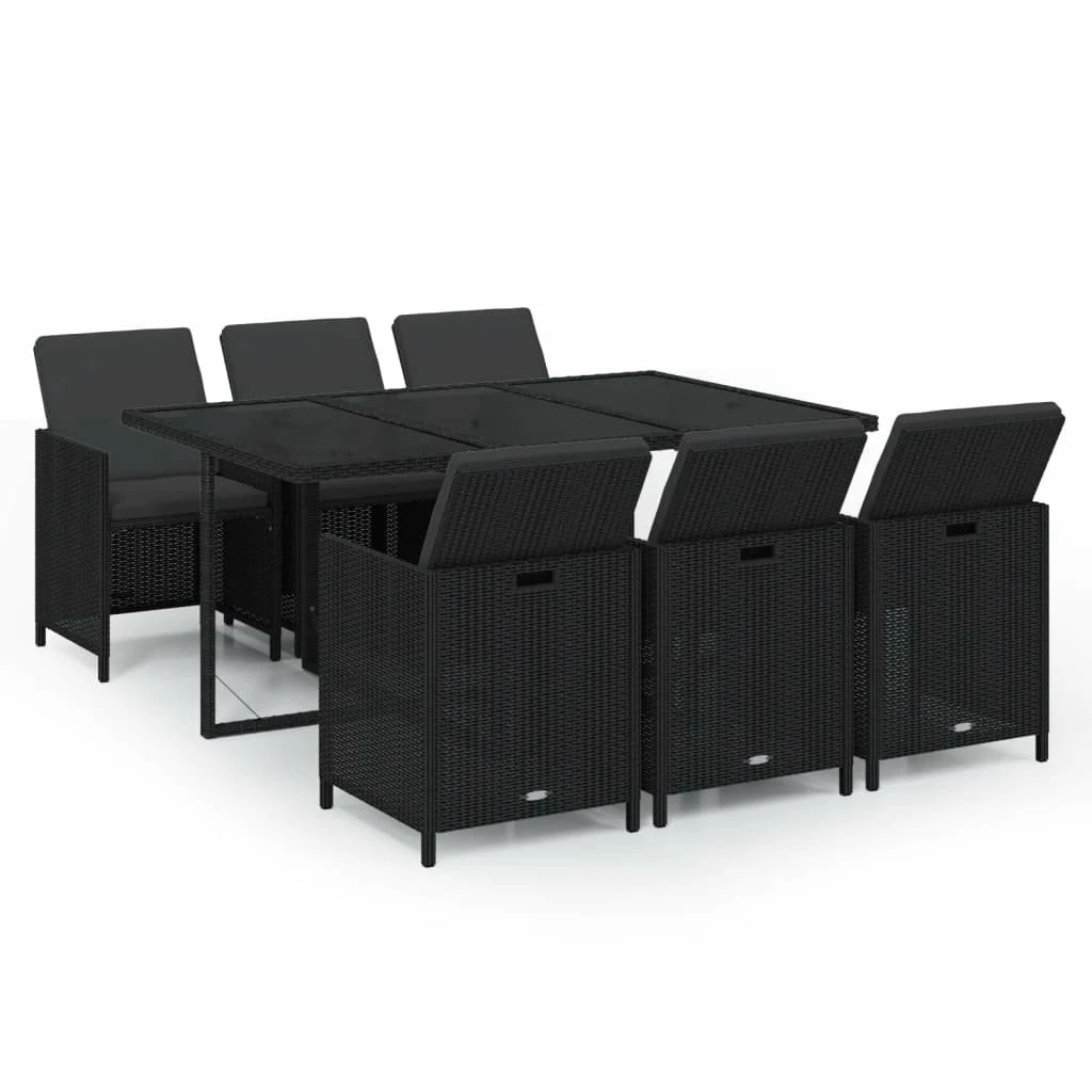 Este juego de comedor de jardín clásico, con un diseño elegante y contemporáneo, será una excelente opción para cenar o relajarse en el jardín. Apto para uso en exteriores: Hecho de ratán sintético resistente al agua y a la intemperie, este juego de comedor para jardín es fácil de limpiar, resistente y adecuado para usar a diario. Estructura robusta: Con una estructura de acero con recubrimiento en polvo, el juego de muebles de patio es robusto y duradero. Experiencia cómoda: El asiento y los cojines traseros gruesos, suaves y rellenos de espuma también añaden comodidad a los asientos. Diseño flexible: Puedes tirar del respaldo hacia abajo y almacenar las sillas debajo de la mesa, con el fin de ahorrar un valioso espacio de almacenamiento cuando no uses el conjunto. Gracias a la estructura ligera, todos los artículos son fáciles de mover. Nota:Para prolongar la vida de tus muebles de exterior, te recomendamos que los protejas con una funda impermeable. Color: NegroColor del cojín: NegroMaterial: Ratán PE, acero con recubrimiento en polvo, vidrio templadoMaterial del cojín: Tela (100% poliésterMaterial de relleno del cojín: EspumaDimensiones totales de la mesa: 163 x 107 x 74 cm (largo x ancho x altoDimensiones de la silla: 52 x 56 x 85 cm (ancho x profundo x altoDimensiones de asiento: 46 x 41 cm (ancho x profundoAltura del asiento desde el suelo: 45 cmAltura del reposabrazos desde el suelo: 64 cmDimensiones del cojín del asiento/respaldo: 46 x 41 x 5 cm (ancho x profundo x grosorRequiere montaje: SíLa entrega incluye:1 x Mesa con estructura extensible6 x Sillas6 x Cojines de asiento6 x Cojines de respaldo