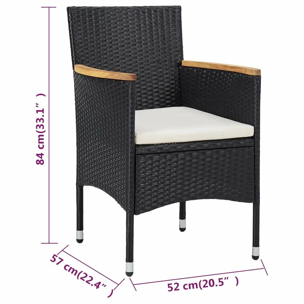 ¡Disfruta de una buena comida o cena en el espacio al aire libre de tu casa con este juego de comedor para jardín! Con un diseño elegante, ¡se convertirá en el centro de atención del jardín o patio! Material de primera calidad: Resistente marco de acero envuelto con ratán PE tejido a mano resistente al clima, este juego de jardín es resistente al óxido y al moho, lo que puede proporcionar años de relajación de calidad.Estructura robusta y estable: Las estructuras de acero garantizan su solidez y estabilidad.Sillas cómodas: Diseñada con un respaldo y un reposabrazos curvados, la silla reclinable de jardín tiene una forma más ergonómica para ofrecer la máxima comodidad. Se incluyen cojines para un soporte adicional y la funda de cremallera se puede quitar para facilitar la limpieza. Nota:Para prolongar la vida de tus muebles de exterior, te recomendamos que los protejas con una funda impermeable. Mesa:Color: NegroMaterial: Acero con recubrimiento en polvo, vidrio templado, ratán sintéticoDimensiones de la mesa: 200 x 150 x 75 cm (largo x ancho x altoGrosor del vidrio: 5 mmSilla:Color de la silla: NegroColor de cojines: Blanco cremaMaterial de la silla: Ratán sintético, acero, madera de acacia macizaDimensiones de la silla: 52 x 57 x 84 cm (ancho x profundo x altoAncho del asiento: 39/44.5 cmProfundidad del asiento: 46 cmAltura del reposabrazos desde el suelo: 62/65 cmDimensiones del respaldo: 38/45 x 53 cm (ancho x altoGrosor del cojín del asiento: 4 cmReposabrazos decorados con madera de acaciaResistente a la intemperieFácil de mantenerRequiere montaje: SíLa entrega incluye:1 x Mesa10 x Silla10 x Cojines de asiento