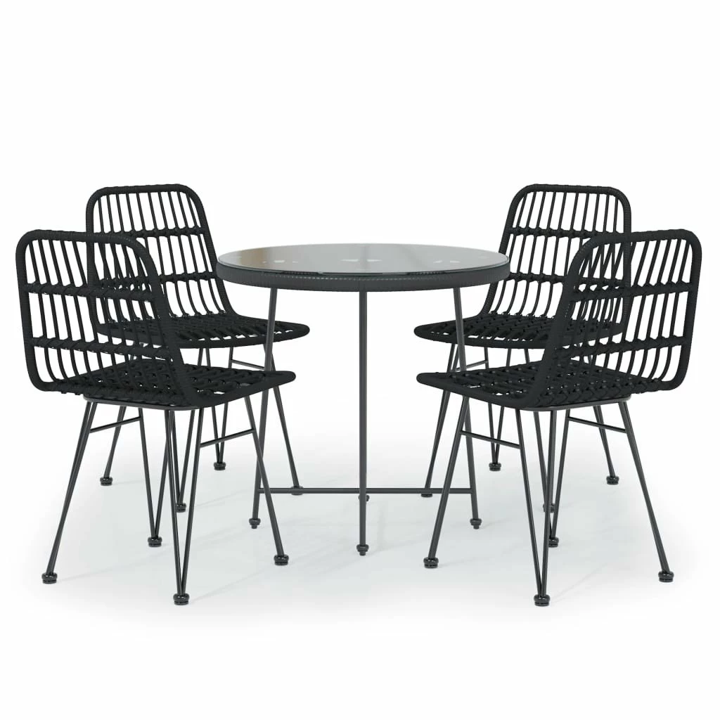 ¡Crea una estética atractiva y cohesionada en el espacio al aire libre de tu casa con este juego de comedor para jardín! Material duradero: El ratán PE, también conocido como ratán sintético, es resistente a la intemperie y fácil de limpiar. La parte exterior se mantiene hermosa durante mucho tiempo. Ofrece una gran calidad, comodidad y aspecto estético.Estructura resistente y estable: Las estructuras de acero hacen que el conjunto de patio sea resistente y estable para el uso diario al aire libre.Práctica superficie: La superficie lisa de la mesa de comedor está hecha de vidrio templado, fácil de limpiar con un paño húmedo. Además, la robusta superficie de la mesa es perfecto para colocar comidas, bebidas y otros elementos decorativos.Asientos cómodos: La silla de comedor está diseñada con un respaldo para ofrecer una experiencia de asiento cómoda.Prácticas almohadillas: El juego de muebles viene con tacos en las patas, para que se apoye en el suelo con firmeza. Nota:Para prolongar la vida de tus muebles de exterior, te recomendamos que los protejas con una funda impermeable.Cada producto viene con un manual de montaje en la caja para facilitar el montaje. Mesa:Color: NegroMaterial: Acero, vidrio templado, polietileno con aspecto de ratánDimensiones: 80 x 74 cm (diámetro x altoDimensiones del tablero de la mesa 80 x 0,5 cm (diámetro x altoSilla:Color: NegroMaterial: Acero, polietileno con aspecto de ratánDimensiones: 48 x 62 x 84 cm (ancho x profundidad x altoDimensiones del asiento: 48 x 44 cm (ancho x profundoAltura del asiento: 47 cmLa entrega incluye:1 x Mesa4 x Sillas