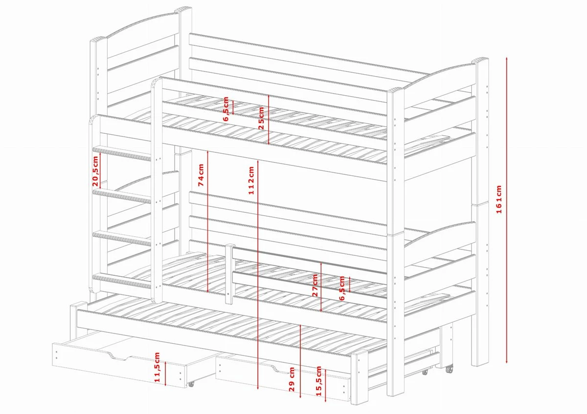 ¡Todos a bordo! Litera de cezar para 3 personas de FurnluxRoomes triples para niños: ¿es cómodo? ¡Sí, claro! La cama base de Cezar es un mueble que ofrece espacio para hasta tres niños y les ofrece un sueño tranquilo y agradable. El marco de Cezara está hecho de madera de pino de alta calidad, lo que garantiza la estabilidad y la durabilidad durante años. El nivel más bajo es una parte de extracción de 10 cm más corta que los otros niveles.