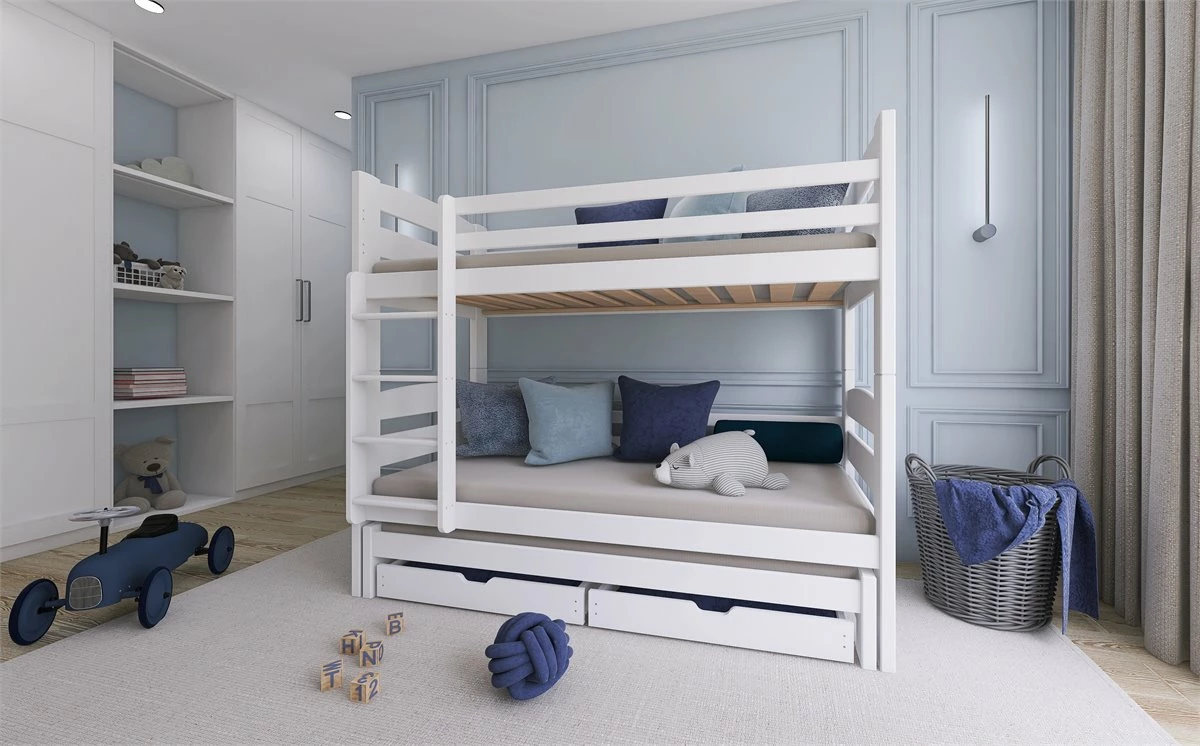 ¡Todos a bordo! Litera de cezar para 3 personas de FurnluxRoomes triples para niños: ¿es cómodo? ¡Sí, claro! La cama base de Cezar es un mueble que ofrece espacio para hasta tres niños y les ofrece un sueño tranquilo y agradable. El marco de Cezara está hecho de madera de pino de alta calidad, lo que garantiza la estabilidad y la durabilidad durante años. El nivel más bajo es una parte de extracción de 10 cm más corta que los otros niveles.