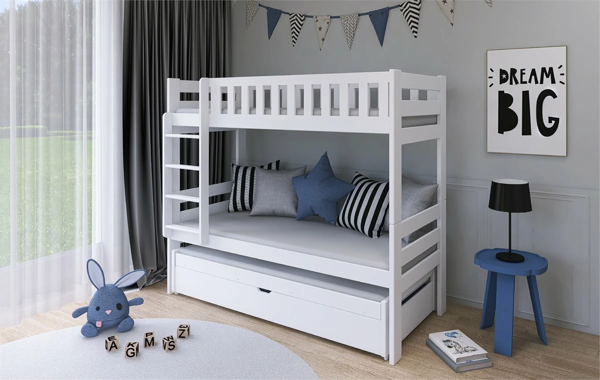 Harvey Bunk Bed: un aspecto clásico con un toque interesanteEl modelo presentado parece una litera clásica. De hecho, Harvey incluso ofrecerá a tres usuarios jóvenes con éxito porque pueden sacar una plataforma adicional de su parte inferior con un colchón de sueño. ¡Descubre más secretos de este mueble para una habitación para niños!