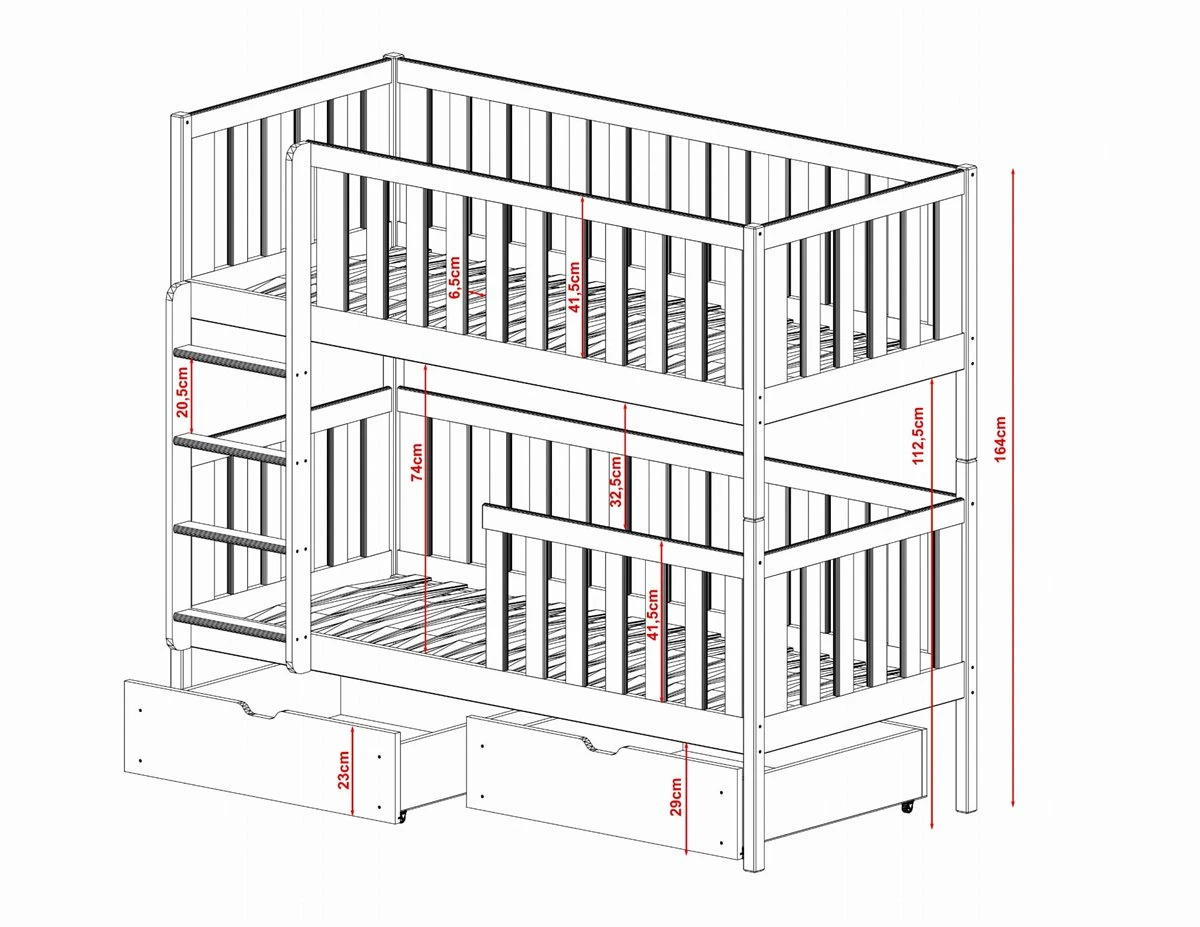 Cama de piso Michalina von Furnlux: la mejor solución para una habitación para niñosTodas las camas de Furnlux están libres de bordes afilados para que sus hijos siempre estén a salvo mientras duermen. La litera de Michalina también estaba equipada con una barandilla de protección alta, de modo que incluso los niños más activos no están expuestos al riesgo de caer. Una escalera amplia y cómoda hace que sea más fácil subir a la parte superior del piso. El marco de la cama está hecho completamente de madera de pino, que se caracteriza por una buena elasticidad y durabilidad y no requiere un cuidado elaborado. En Furnlux, la salud de sus hijos es importante para nosotros, por lo que el marco está cubierto con un color antialérgico en un agua, independientemente del color de la cama.